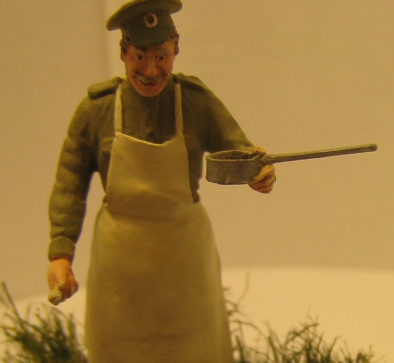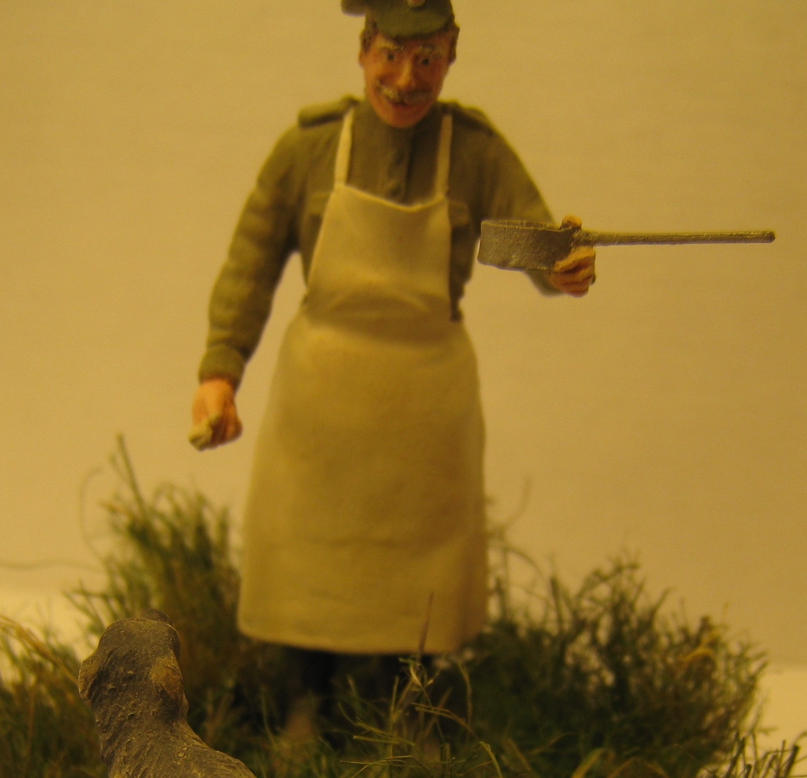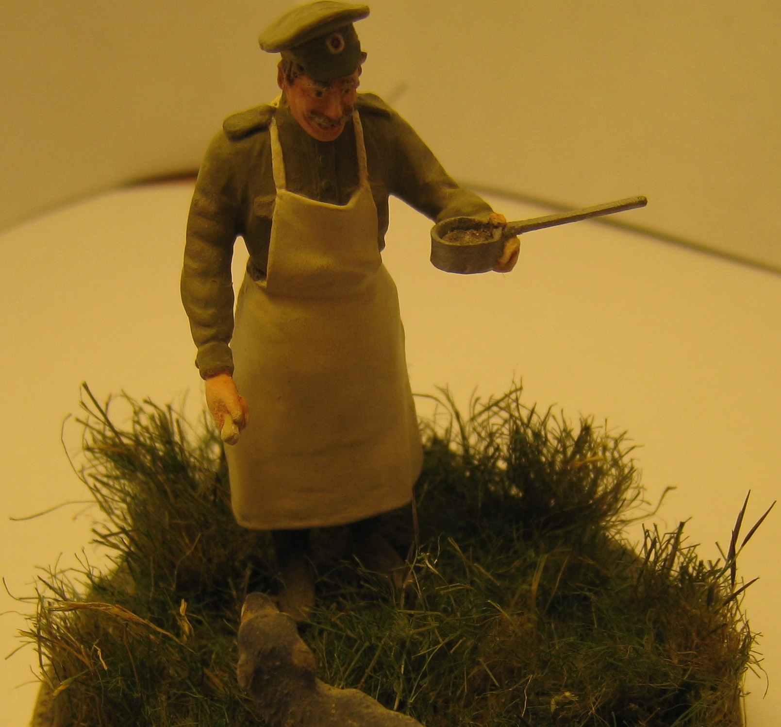 Повар русской армии времён Первой Мировой войны и бездомная собачка.Даже каждый день имея дело со смертью нужно оставаться человеком.Собака из набора американских танкистов в Ираке фирмы Мастербокс, фигурка от Мастерклаб - поменял только положение головы и заменил руку(кстати, рука от тех же американцев ).Трава - окрашенная пакля и немного колосков какой-то травы с улицы.Краски:Акан, Тамия, Звезда, Хоббиколор.