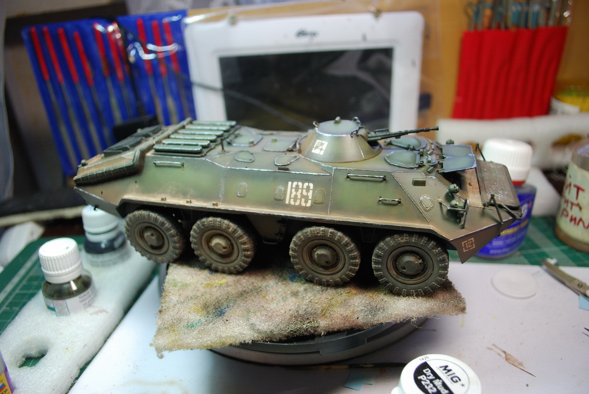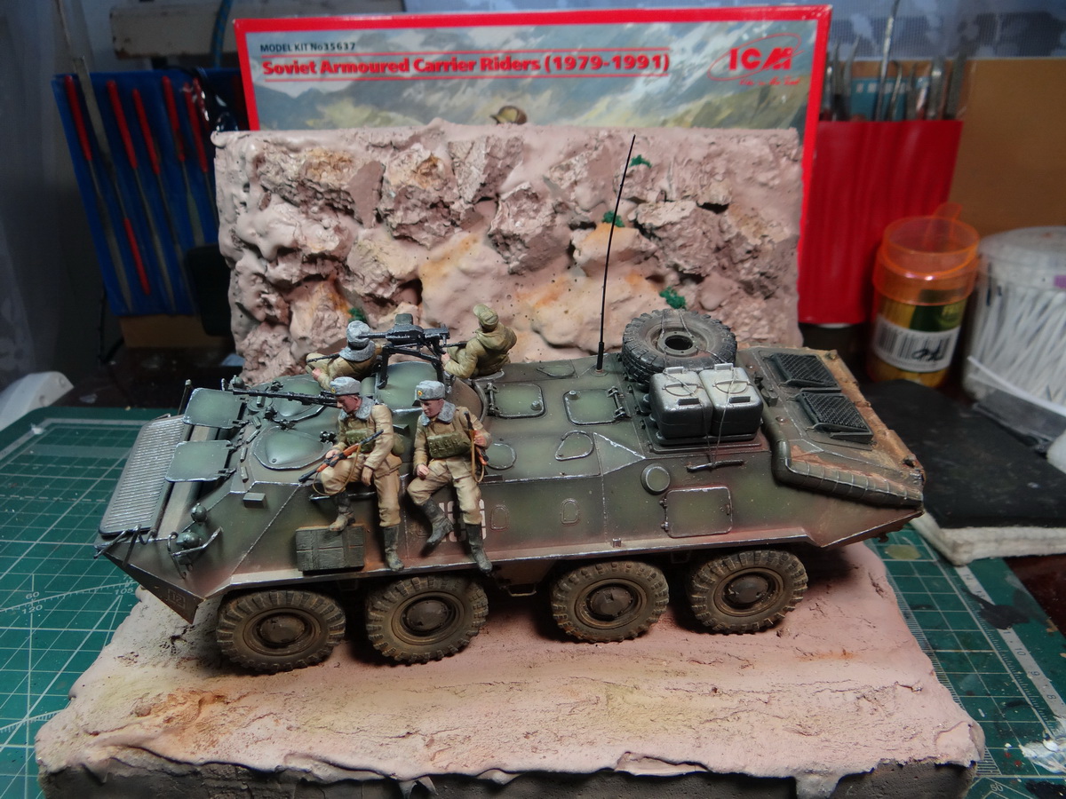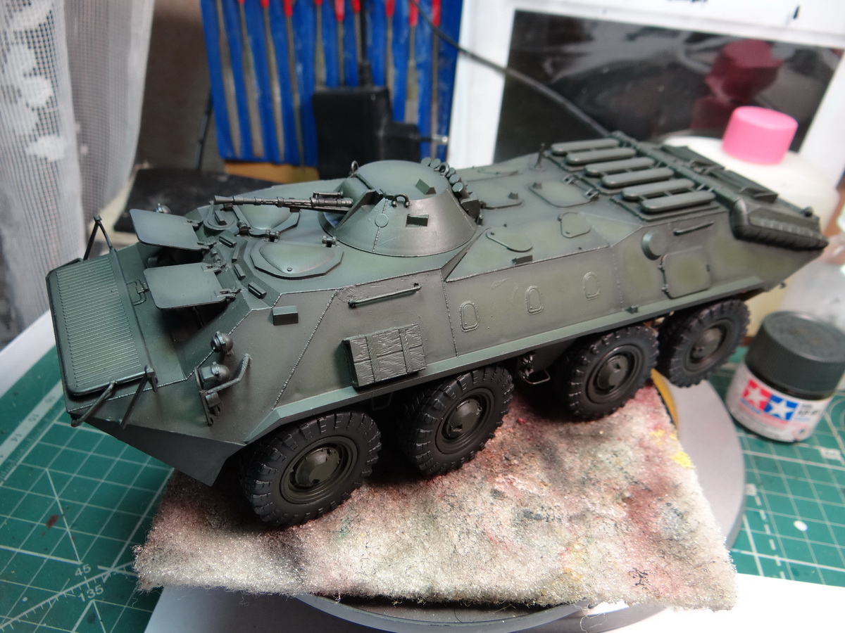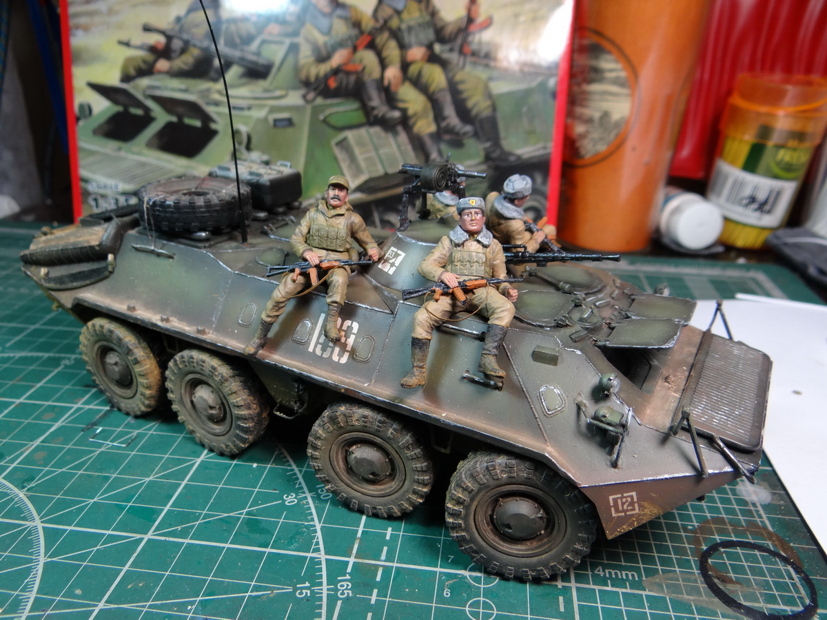 Звездовский БТР-70, все вроде прекрасно, только задняя часть корпуса упорно не захотела состыковаться с нижним и верхним корытом. Сначала хотел сделать двухцветный камо, но нет опыта, плюнул и решил сделать монотонную окраску. Покраску делал по ролику Warfare in Scale Cold War Series Episode 1 - Russian BTR-70 1-35 Dragon Models с ютуба, очень понравилось, показалось что это куда быстрее нежели "классическая испанская школа", нет этой кучи слоев - высветлений, здесь только грунтовка, базовый темный слой, одно высветление от центра поверхностей корпусных деталей и люков, матовый лак от Звезды и фильтр Flat Earth XF-52 поверх. Краски Tamiya XF, солдатики полностью темпера. Потертости - алюминий от Звезды, такой пластиковый флакончик, у Звезды вообще лучшие в мире металлики по натуральности. Пигменты - MIG и Мастер пигмент. Добавил латунную сетку 0,6 на вентиляционную решетку, АГС, запасное колесо и баки КП из набора бэтра.