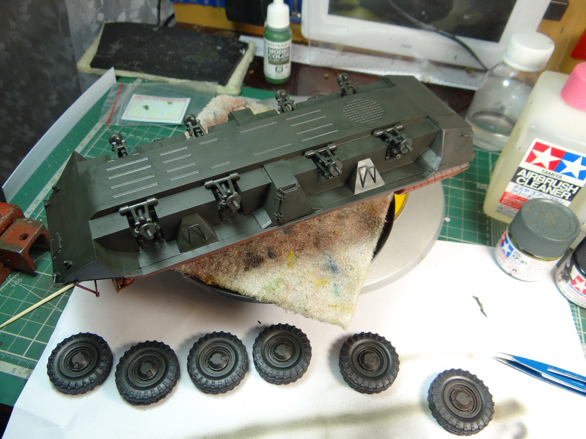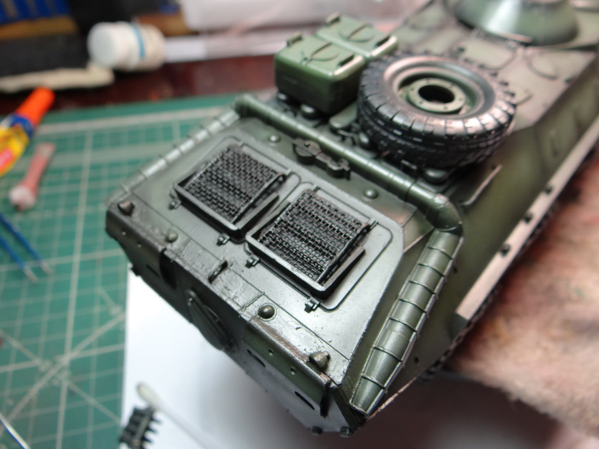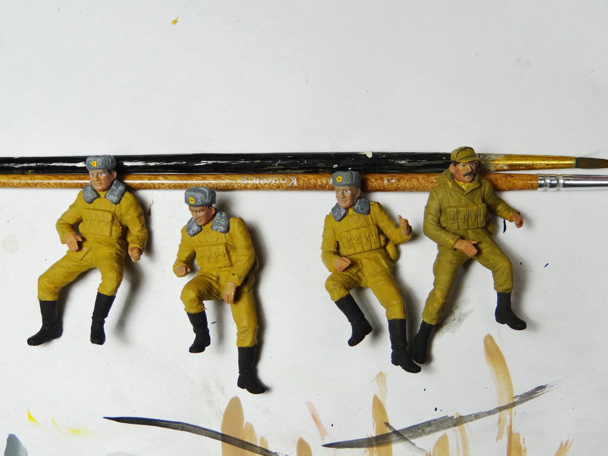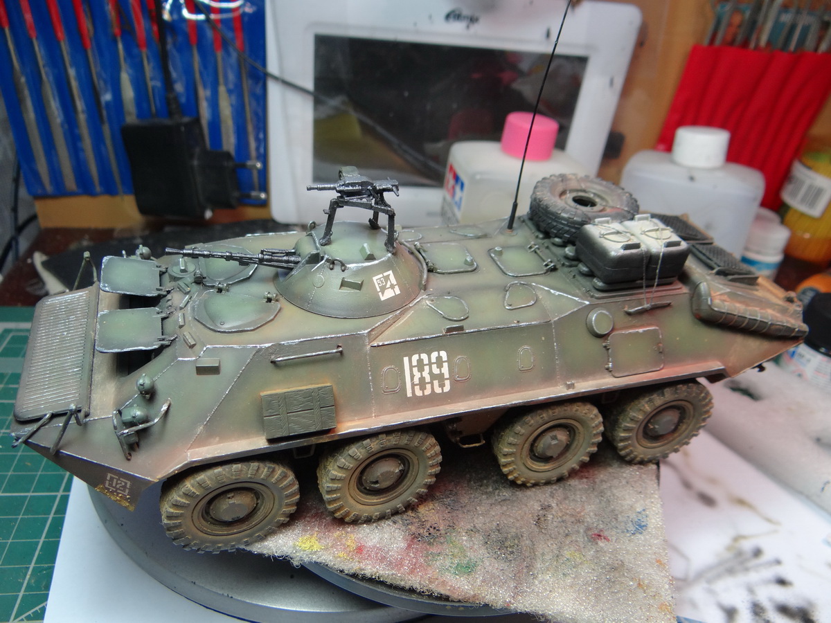 Звездовский БТР-70, все вроде прекрасно, только задняя часть корпуса упорно не захотела состыковаться с нижним и верхним корытом. Сначала хотел сделать двухцветный камо, но нет опыта, плюнул и решил сделать монотонную окраску. Покраску делал по ролику Warfare in Scale Cold War Series Episode 1 - Russian BTR-70 1-35 Dragon Models с ютуба, очень понравилось, показалось что это куда быстрее нежели "классическая испанская школа", нет этой кучи слоев - высветлений, здесь только грунтовка, базовый темный слой, одно высветление от центра поверхностей корпусных деталей и люков, матовый лак от Звезды и фильтр Flat Earth XF-52 поверх. Краски Tamiya XF, солдатики полностью темпера. Потертости - алюминий от Звезды, такой пластиковый флакончик, у Звезды вообще лучшие в мире металлики по натуральности. Пигменты - MIG и Мастер пигмент. Добавил латунную сетку 0,6 на вентиляционную решетку, АГС, запасное колесо и баки КП из набора бэтра.