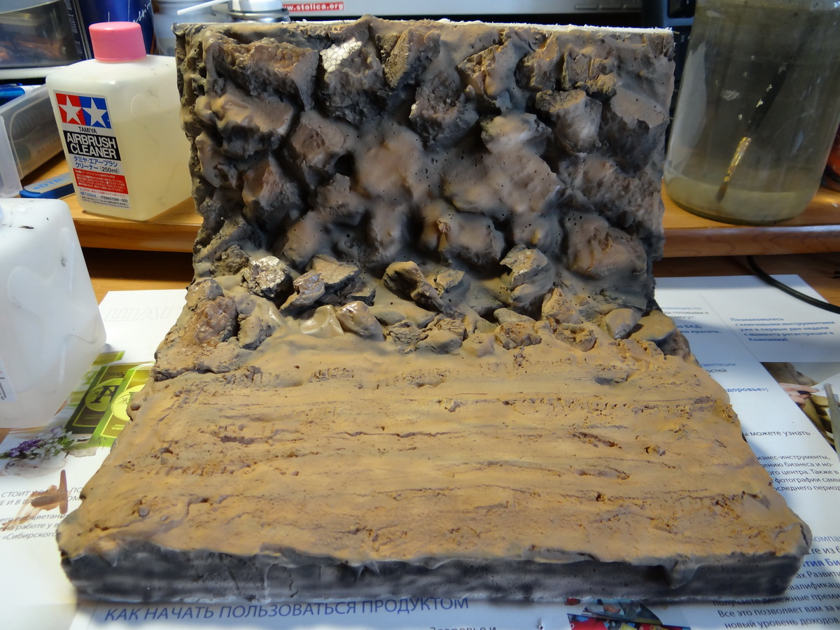 Что касается основания - у меня валяется несколько гипсовых заготовок, к одной из них добавил "скалу" из упаковочного пенопласта, к скале прилепил на жидкий гипс с ПВА и водой плоские куски того-же пенопласта, под скалу набросал кусочки каменного угля - у него подходящая структура поверхности при раскалывании. Всю кучу покрасил Тамией в четыре слоя, добавил чуть пигментов и несколько "пучков травы" крашеного поролона производства "Я моделист". Конечно эта основа коротковата для диорамы, но для виньетки что надо.