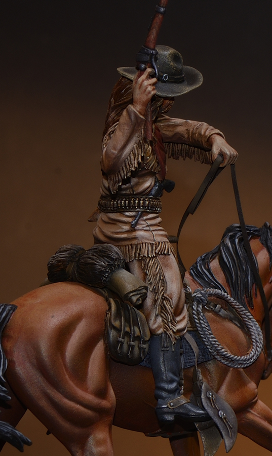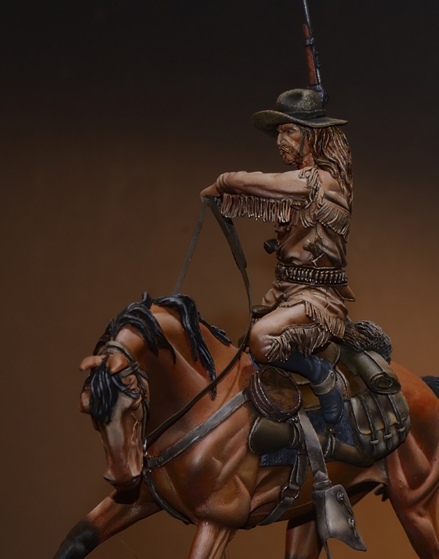Я думал это ни кто иной, как Баффало Билл, он же Уильям Коуди. Знаменитый охотник на бизонов, создавший в последствии цирковое шоу "Дикий Запад". На мой взгляд имеется портретное сходство. Позы во время охоты на бизонов могли приниматься самые разные. Смотрели "Танцующий с волками"? Там сцена такой охоты отлично показана. Например в тесноте и давке лошадь могла бежать вплотную с бизоном и всадник, чтобы не повредить ногу вполне мог подтянуть ее к седлу.