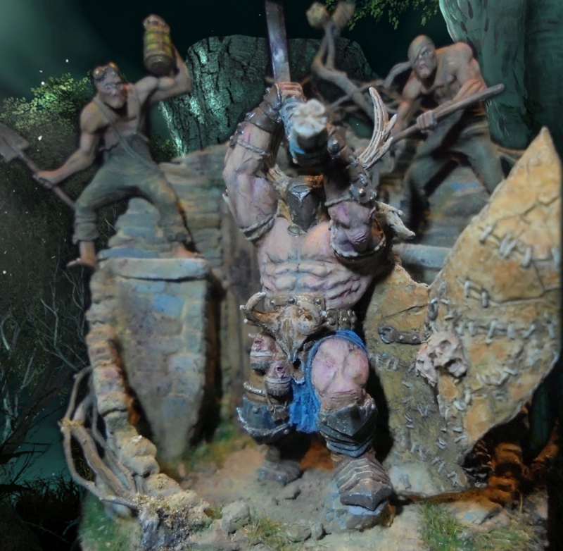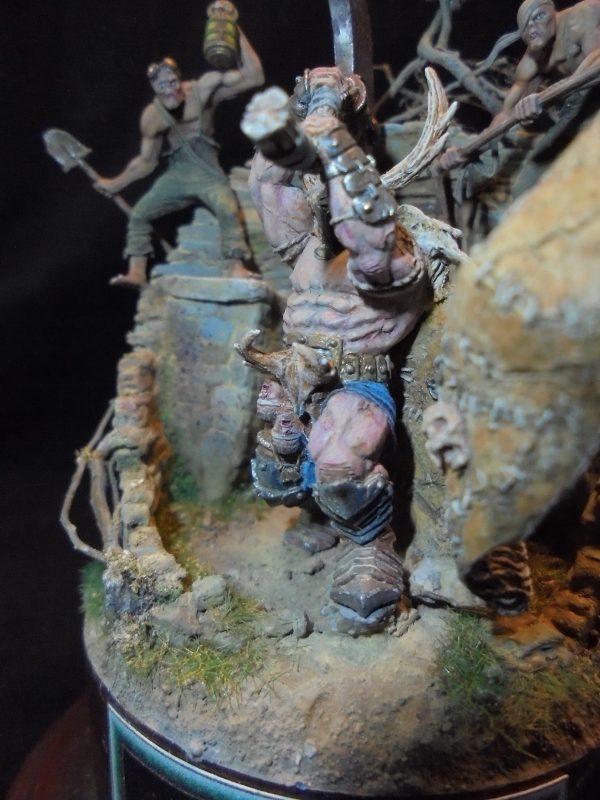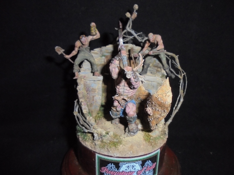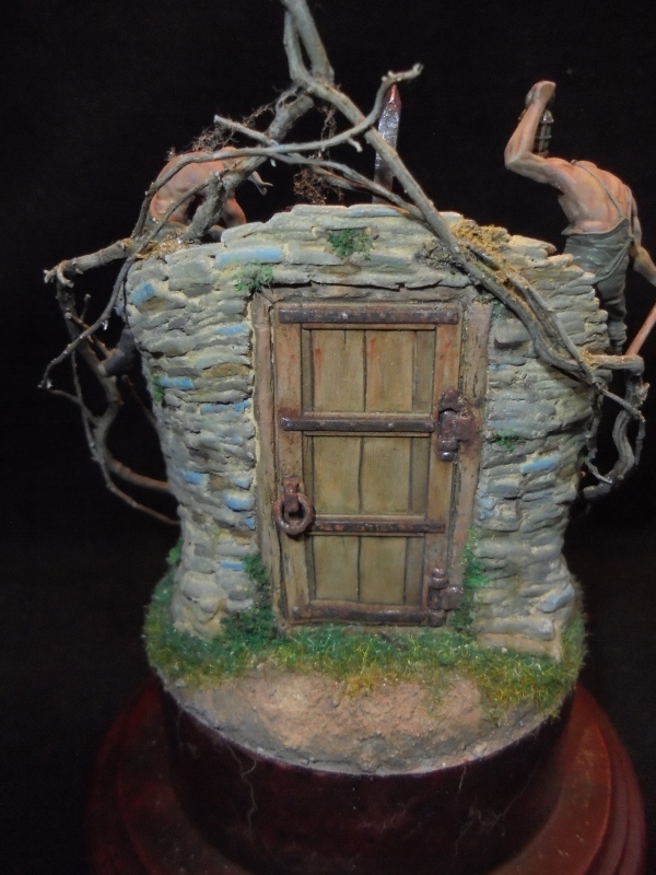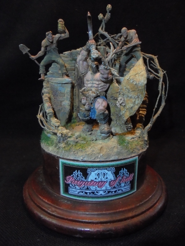 Основание стены лепилось из модельной пасты"Jovi".Сучья деревьев изготовил из запасенных заранее корешков кустов(предварительно высушенные).В миниатюре использованы фигуры от фирм"Merce miniatures"40мм и "Wyrd"28мм из игрового мира"Malifaux".Дверь взял от старого набора"Крепость" фирмы "Технолог".В росписи были задействованы краски Валеджио,Р-3,АК,весь арсенал химии нашего испанского друга Мигеля.Паутинка на черепах настоящая,нашел в углу комнаты.Во время орошения песочка"красненьким" рука с аэрографом дрогнула,в результате переборщил с хардкором и забрызгал все вокруг.Ну,будем считать,что грешники получили по заслугам.