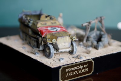 Модель "TAMIYA" Hanomag Sdkfz 251/1. Окрашивалась акрил "TAMIYA", Флаг и Скатки из бумажных одноразовых полотенец+ клей ПВА, Трещины на диораме- Паста кракелюрная двухкомпонентная. Трава- лён сантехнический. Колодец, камни, скелет - слеплены из Керапласта "KOH-I-NOOR" и окрашены акрилом "TAMIYA". Модель миниатюры "Alpine" окрашивалась акрил "TAMIYA" и темпера "Мастер класс".