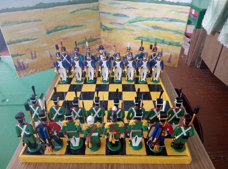 Выкладываю шахматы. Противники - русские и французы. Как и все предыдущие миниатюры сделаны из фанеры. Привожу расшифровку миниатюр.