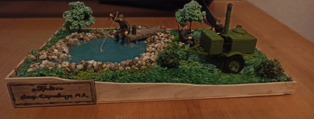 Не ловят рыбу в джакузи! Да, именно джакузи у Вас получилось - хоть и дизайнерское, обложенное искусственным камнем. Натуральные камни на диораме 1:35 (не говоря уже про более мелкие масштабы) выглядят НЕ натурально: их текстура оказывается не масштабной и смотрится нарочито. К тому же размер: при пересчёте в масштаб это получаются полуметрового размера валуны. По возможности избегайте использования натуральных материалов: они слишком узнаваемы. Да и где Вы видели берег естественного водоёма, заботливо обложенный валиком камней, возвышающимся над окружающим ландшафтом? Берег должен идти вверх по мере удаления от уреза воды.