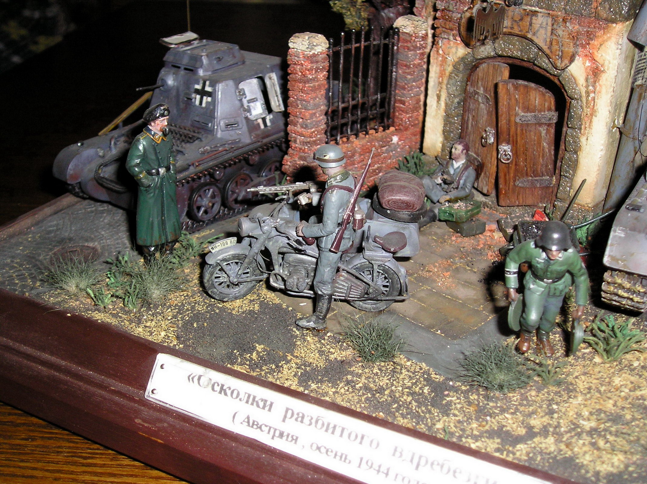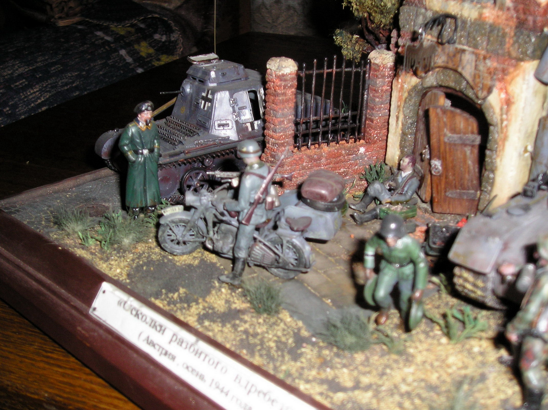 Благодарю за отзывы.Данная диорама действительно первая и достаточно давняя - 2002 г., чем, надеюсь и объясняются справедливо указанные недостатки. Что касается блеска, то в те далекие годы красок нормальных не было, мешал сам различную нитру. Теперь почему Австрия - видел на одной фотографии похожий деревенский кабачок, маленький и симпатичный, захотелось воспроизвести.