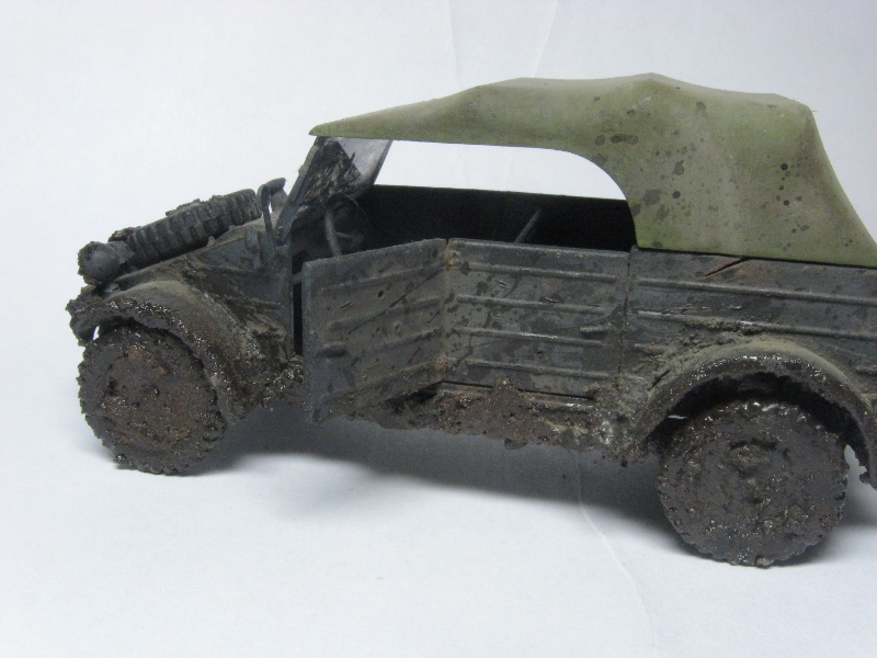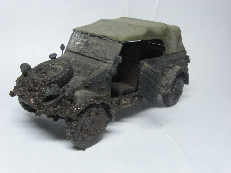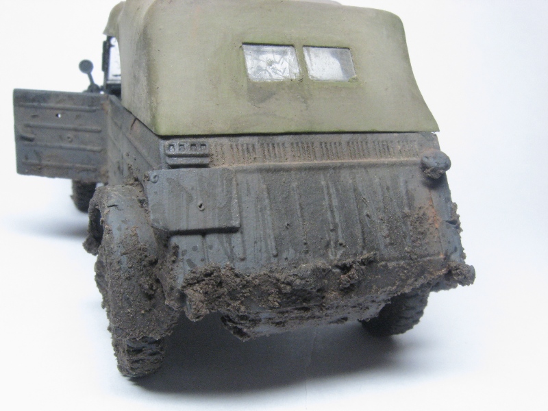 GISH, Вечер добрый.Для начало неплохо, простреленное стекло очень натурально.Только это не БТР при таких пробоинах тент и салон должны быть в клочья. Как я понял заливку вы сделали,а проходить сухой кистью почемуто не стали на мой взгляд напрасно.Теперь о грязи на второй серии снимков получилась жидкая грязь она ложится сравнительно тонким слоем, а комья должны быть более пористыми и не блестеть.