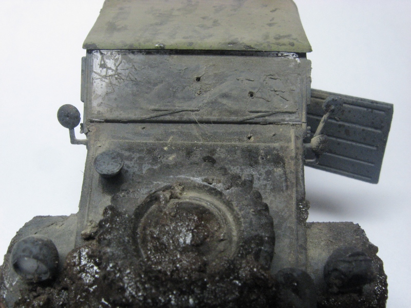Вот что я подумал: стекло можно ещё загадить. А потом "протереть тряпкой". Характерно так, со стороны водителя. Сырую грязь насытить лаком обязательно! И морду ещё обгадить, сверху- если уж стекло закидало, значит за танком лихо шёл, либо в лужи нырял без раздумий :)