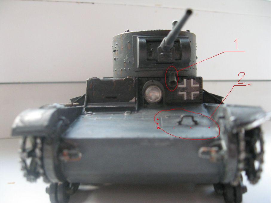 . Начну с бащни. Перископ слишком грубо сделаны его лучше срезать. Маска пушки неверна (на настоящей маске левая часть отличалась от правой), заклёпки были шестигранного сечения. Лучше было поставить от Мастер Клуба. Перейдём к корпусу: СЛИШКОМ сильно помят и заржавлен глушитель при том, что ржавчины вообще не много. Ручка на лобовой броне толстовата. Рёбра жесткости тоже, лучше было изготовить их из тонкого металла. Решётка сзади слишком крупна. Ржавчина не очень хорошо вышла, запыления и грязи нет вообще, что очень жаль.