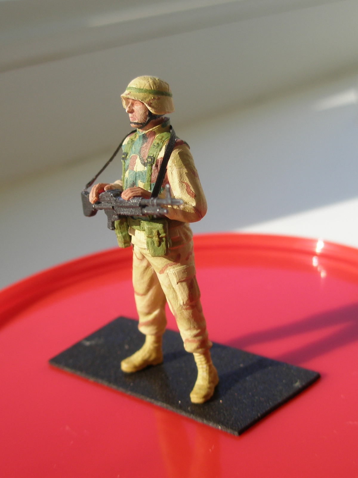 Наконец-то я закончил чвою свою первую фигуру набра ICM "American Elite forces in Iraq" в масштабе 1:35 и выкладываю ее на всеобщее обозрение (учитывая уровень работы отсылать для галереии не рискнул). Окрашивалось Харьковским акрилом "Хома", из доработок пулеметный ремень и ремень на каску - сигаретная фольга. Пытался также из фольги зделать нарукавные нашивки первой пехотной дивизии, но к сожалению ничего не получилось.