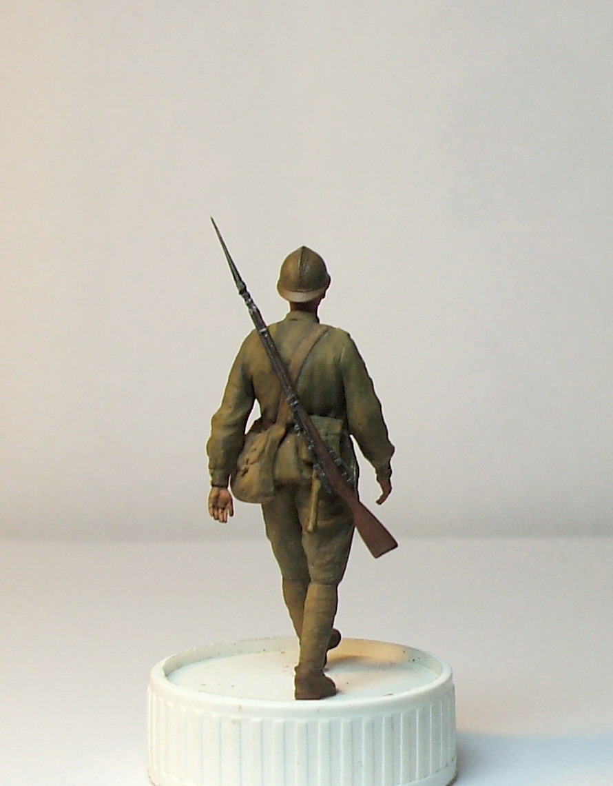 Здравствуйте уважаемые коллеги! Выставляю на суд свою последнюю работу. Это небольшая конверсия миниартовского пехотинца, из знаменитого набора советской пехоты на марше. У данной фигуры была заменена голова(Хорнетовские французы), немного переделана сумка, заменена винтовка и добавлена лопатка. Самым сложным, было вылепить орла на каске адриана! Красил ПВА темперой и акриловым лаком (ремень, каска, винтовка). Получился пехотинец, где-то на период весны-лета 1917 года. В дальнейшем планирую переделать все остальные фигуры из набора, и использовать в одной композиции на диораме! Вам судить, как всё получилось. Стоит ли продолжать?