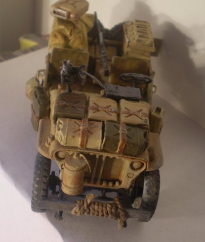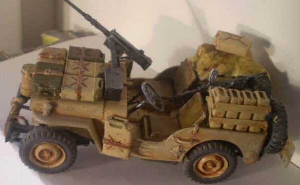 Джип от Tamiya(35033)очень не плох в сборке,но не большие дороботки потребовались.Из доработок:лента на пулемёт,канистры немецкие,"ручки" для канистр из поллистирола.Окраска-кисть акрил звезды пигменты от Tamiya.Это моя первая серьёзная модель.