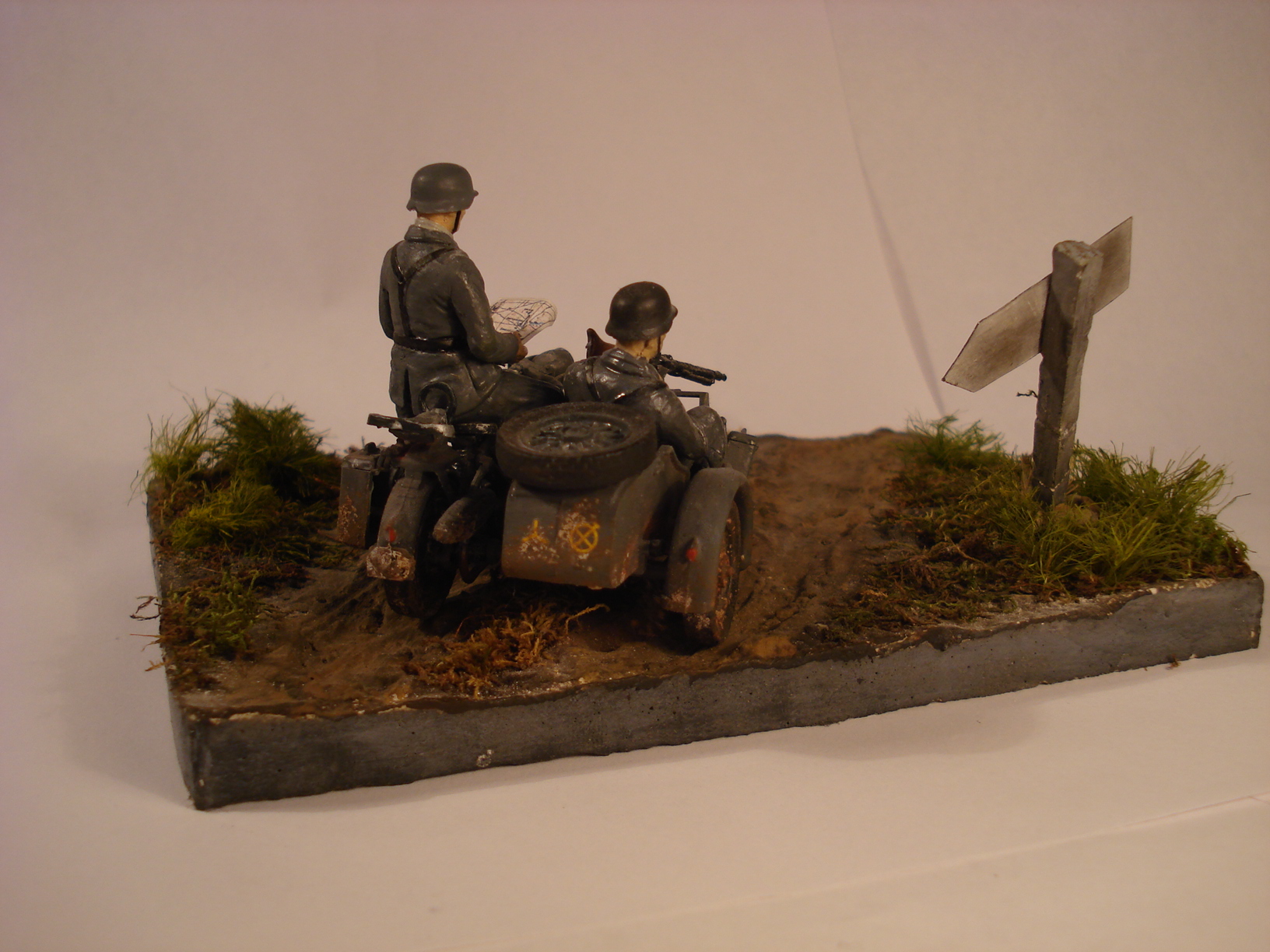 Хочу показать Вам свою первую работу. Мотоцикл BMW R-75 от Звезды, окрашен акрилом этой же фирмы. Основание-гипс, окрашенный гуашью , трава- мох, сантехнический лён.