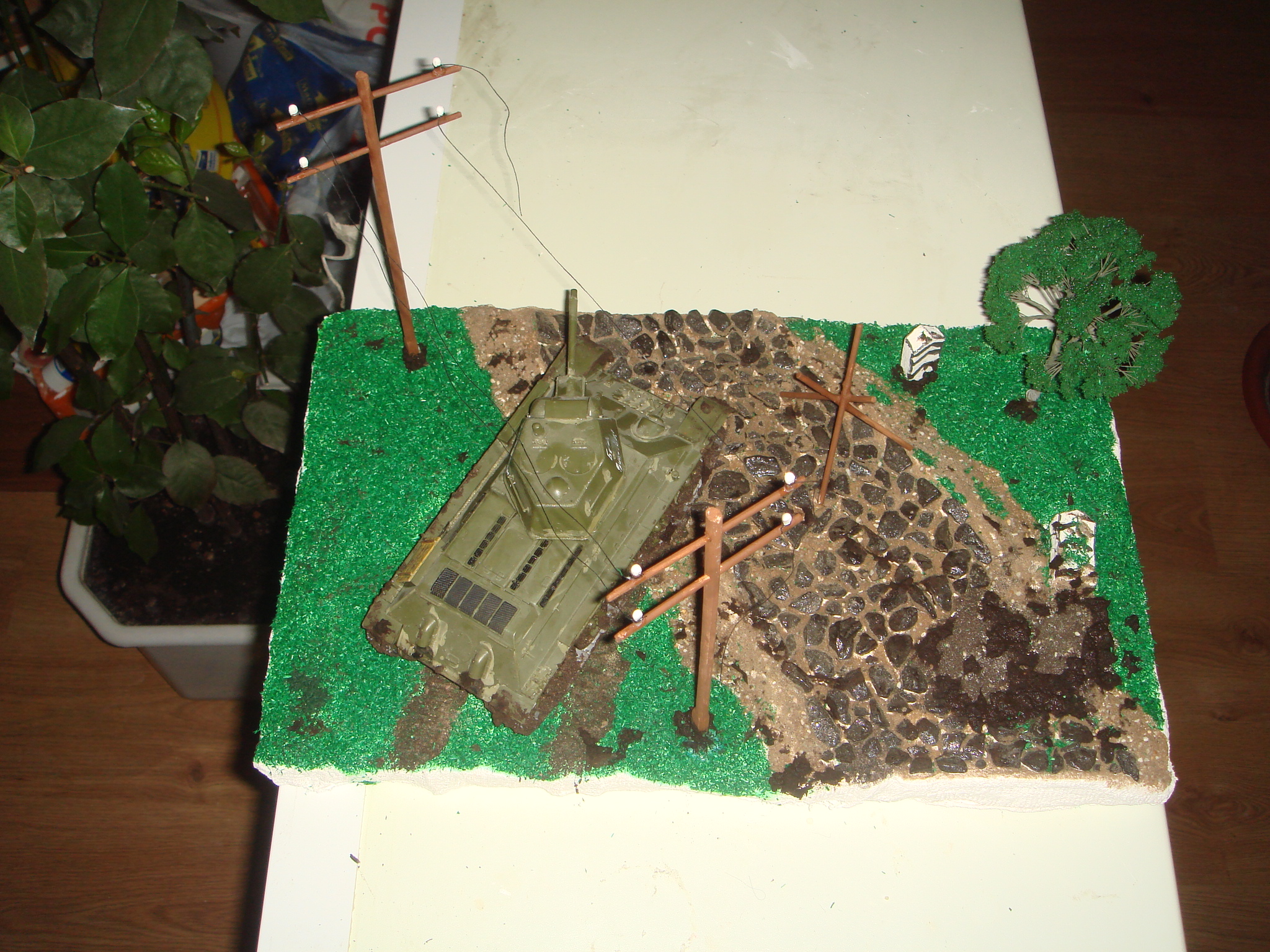 Потом из смеси мелкой цебени и просеенного , мельчайшего песка зделал грунт по бокам дороги.Дальше на высохший гипс на нес слой ПВА и жирно посывал насыпной травой.Линии электро передач порванные в результате немецкой артилерии выпоненны из японских палочек.Противотанковый ёж выполнен из кулинарных шпажек.Дерево,дорожные столбцы и линии электро передач посадил на монтажный клей момент.и В конце в месте где якобы попал артелерийский снаряд я промазал смесью чернозема и ПВА также по периметру диорамы под размазывал земли для большей реалестичности