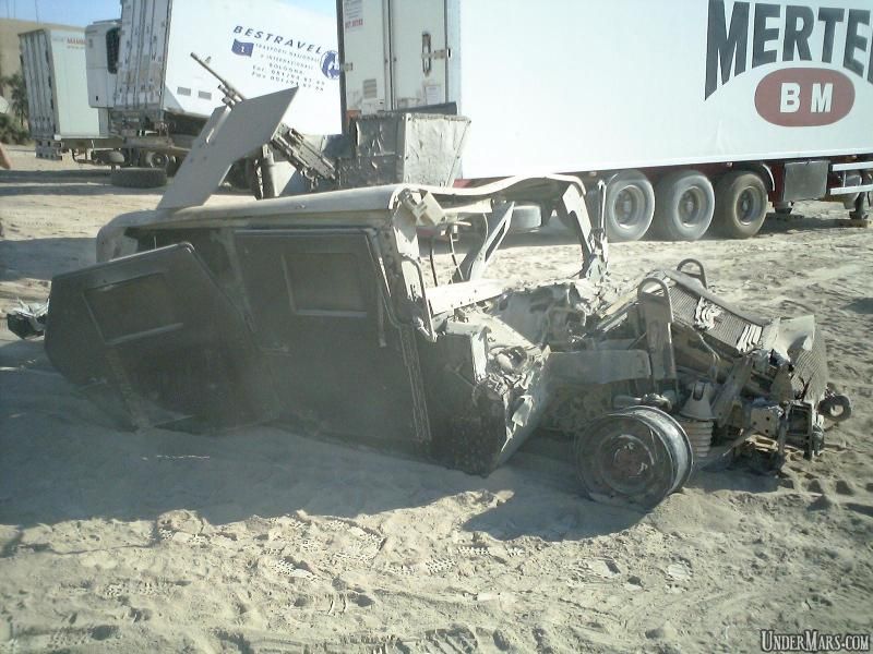 Вот хаммеры пострадавшие от фугасов. Считаю что похоже - направленный взрыв волной корёжит часть металла.