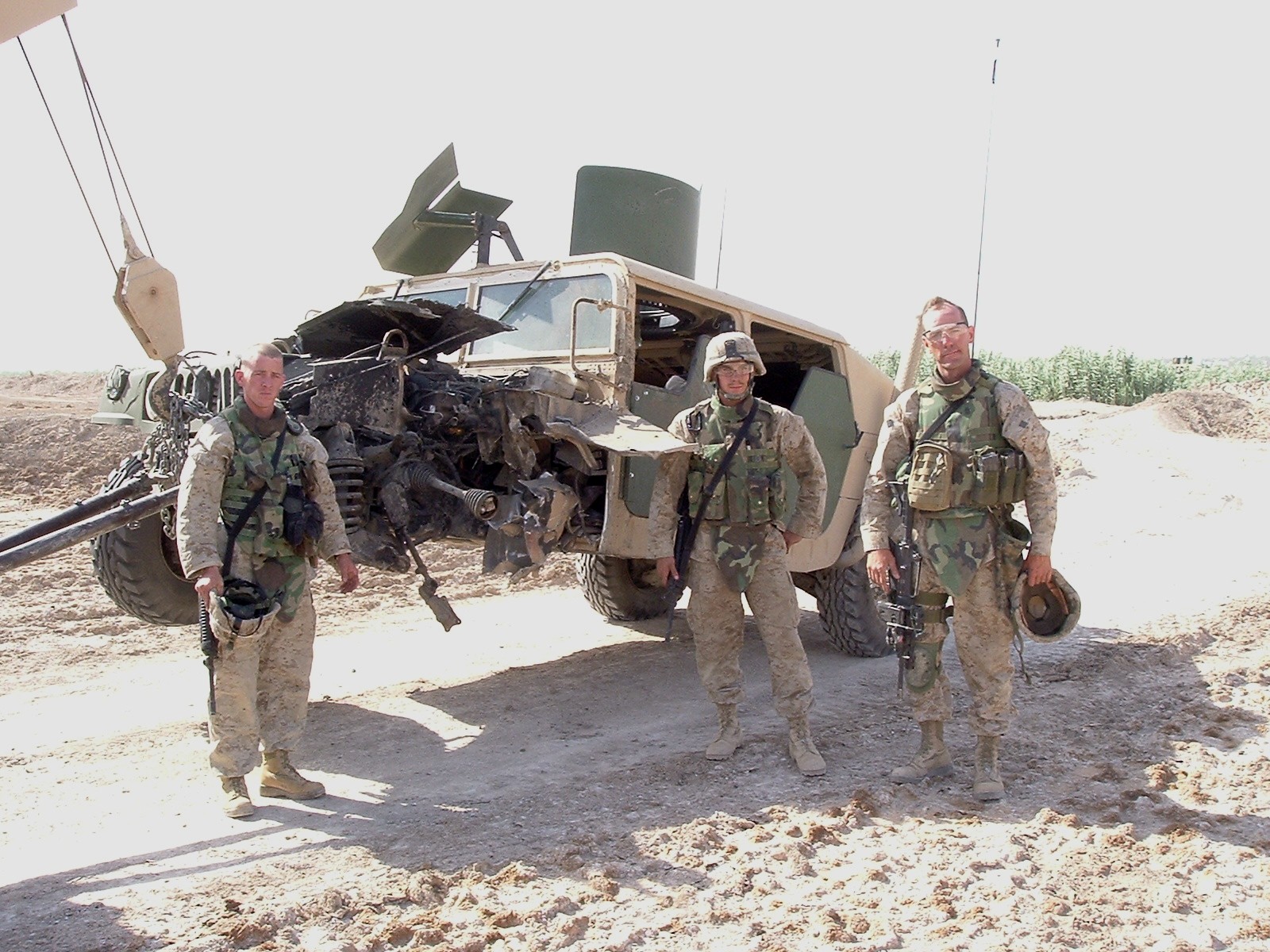 Хаммер оплавлен и изогнут пинцетом,совершенно верно. Идея - взрыв фугасной мины который произошёл в метрах двух сзади-сбоку в результате чего оторвало колесо, вырвало две двери, заднюю дверь и чуть покорёжило. Хаммер не горел. Водила убит в затылок,хаммер без колеса - вот их и снесло в сторону.