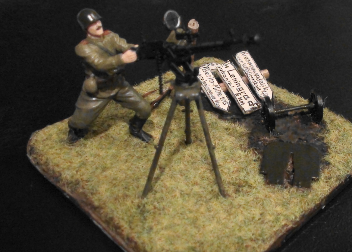 Работа не плохая... но!!!! 1-е я бы сделал затёртый пулимёт 2-е высадил бы полевую траву... 3-е затонировать бы это дело.. и фигура блестит...
