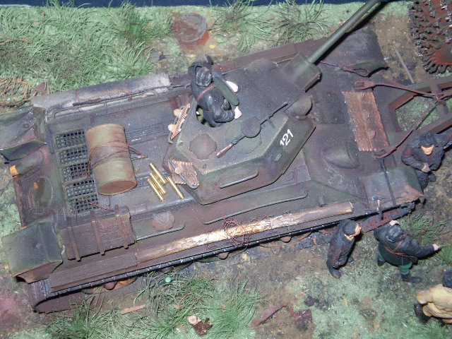 Алексей Хахулин, во-первых, хотелось бы снимков почётче, не разобрать ничего. Во-вторых, фотографировать лучше при искуственном освещении с 2-х точек. Это по качеству предоставляемого наглядного материала. По композиции и рабте, что рассмотреть удалось. Первое - сетку над жалюзи вы совершенно неправильно иммитировали, ячейки под углом 45 градусов идут и они более мелкие. Второе - бочку так на Т-34 невозможно привязать - от жалюзи трос или верёвка оторвётся, точнее, планка скорее всего не выдержит, а на люке доступа к двигателю прицепиться не за что. Что делают гильзы на надмоторной плите - непонятно, "Дегтярь" на башне - тоже. По фигуркам - Показывающий командир и солдат в гимнастёрке "руки в боки", ладно, пришлые, не из экипажа. А остальные, судя по композиции, имеют прямое отношение к данной машине. А в ней не 5 человек экипажа, а только 4, так что один лишний. А когда на башне сидячей фигурки нет, то непонятно, куда оставшийся боец смотрит, как бы вываливается из общей сцены. В отбчем - работайте, товарищ!!!
