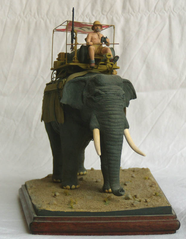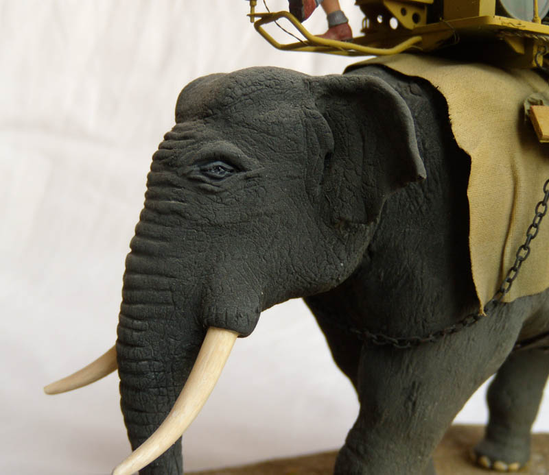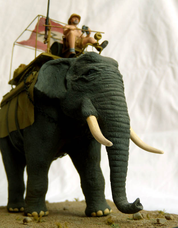 О самой модели - масштаб 1/35. Слон вылеплен из пластики. Внутри корпуса был вставлен деревянный цилиндр - для экономии материала. При запекании - благодаря этому цилиндру слон благополучно треснул.В результате чего его пришлось склеивать циакрином. После запекания и грунтовки я увидел что структура кожи мало походит на слоновью. В результате слон был немного перешкурен, частично перешпаклеван нитрошпаклевкой и заново перегравирован весь рельеф кожи. Вид и сейчас - не айс, но хоть из далека смотрится более менее