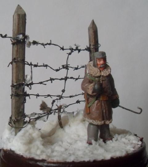 За колючкой -40, какой-то отмороженый урка рванул в бега. Старый конвоир спокоен: далеко не уйдет, не поймают - так замерзнет. В руке держит крюк, с помощью которого цепляли застреленного зэка за одежду и тащили в лагерь. Фигурка из эпоксилина, окрашено акрилом. Делал в 35м масштабе, но какой-то промах был допущен: высота в валенках и ушанке 55мм, но лицо в сравнении с фигурками от "Звезды" больно крупным вышло, карабин как-то не по размеру... Основание: крышка от мармелада, масса для лепки (смесь КЕРА и JOVI). Снег-смесь белого силиконового герметика с ПВА и содой. Хотел отправить в Галерею, но смотрю и понимаю: накосячил, а где - не пойму.
