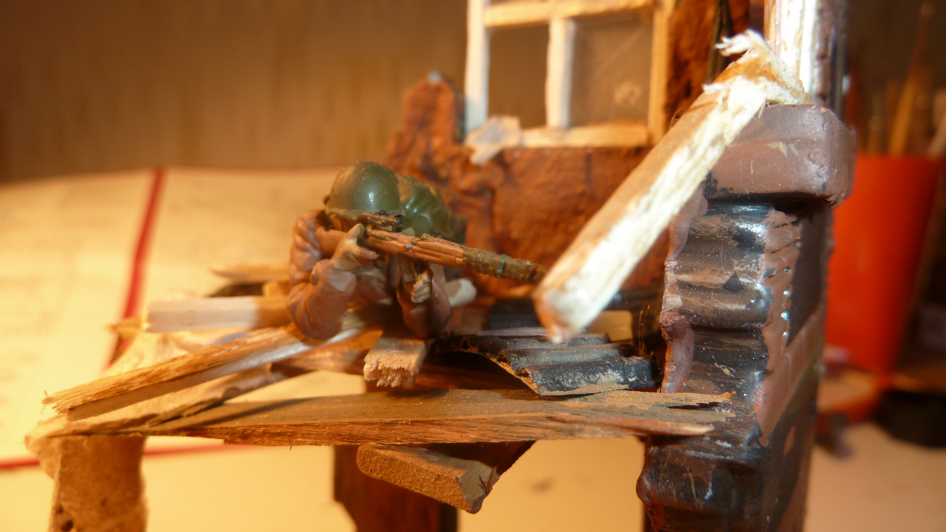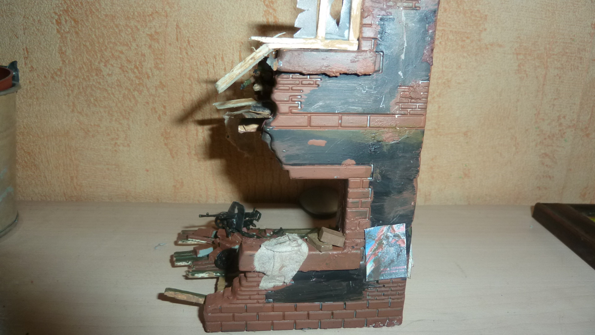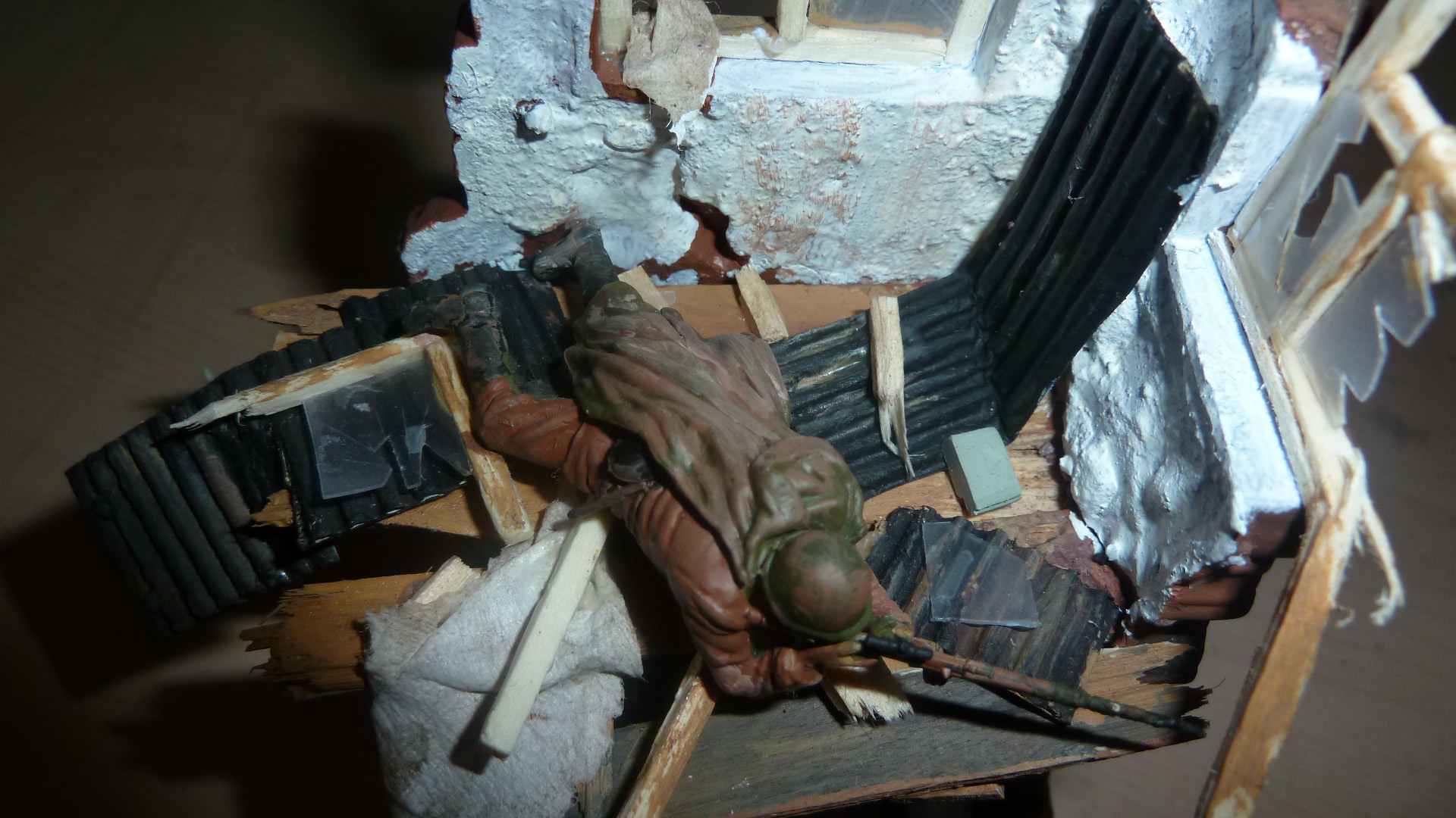 1)Здание делал сам. Откопал в свои пластмассовых солдатиков различные строения.Заполнил пустоты во внешний стороне гипсом. Перекрытие из обломков линейки. Листы железа обычный картон в разрезе окрашенный в чёрный цвет(добавил пигмент ржавчины) Рамы,полы из соломки, продают в книжных магазинах (соломки в наборе нужны для постройки различных изб,церквей и.т.д., но их можно использовать и в других целях,настоящий подарок для моделиста). Кирпичи изготовил из детской глины,окрасил. Тряпки, туалетная бумага смоченная в воде с пва.Стёкла тоненькое орк-стикло,встречается в подарочных магазинов это различные упаковки ёлочных игрушек и прочего (осколки нарезал просто на мелкие кусочки)Плакаты прост распечатал на принтере (маленько состарил).