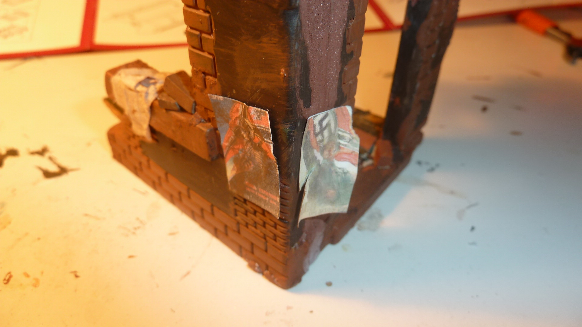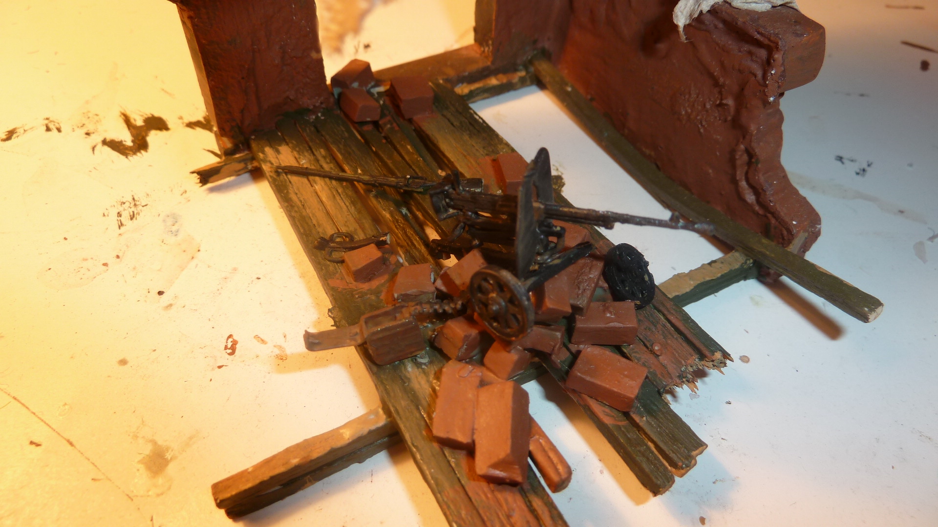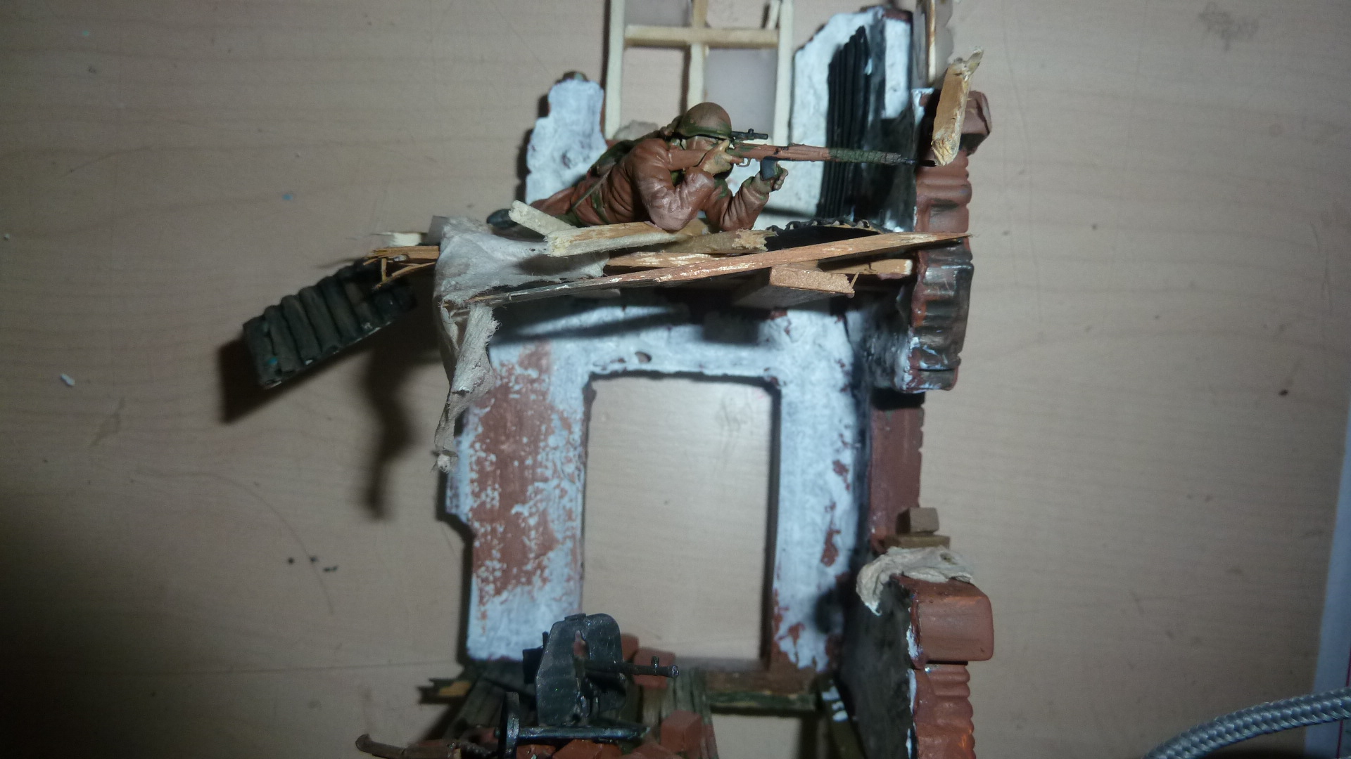 1)Здание делал сам. Откопал в свои пластмассовых солдатиков различные строения.Заполнил пустоты во внешний стороне гипсом. Перекрытие из обломков линейки. Листы железа обычный картон в разрезе окрашенный в чёрный цвет(добавил пигмент ржавчины) Рамы,полы из соломки, продают в книжных магазинах (соломки в наборе нужны для постройки различных изб,церквей и.т.д., но их можно использовать и в других целях,настоящий подарок для моделиста). Кирпичи изготовил из детской глины,окрасил. Тряпки, туалетная бумага смоченная в воде с пва.Стёкла тоненькое орк-стикло,встречается в подарочных магазинов это различные упаковки ёлочных игрушек и прочего (осколки нарезал просто на мелкие кусочки)Плакаты прост распечатал на принтере (маленько состарил).