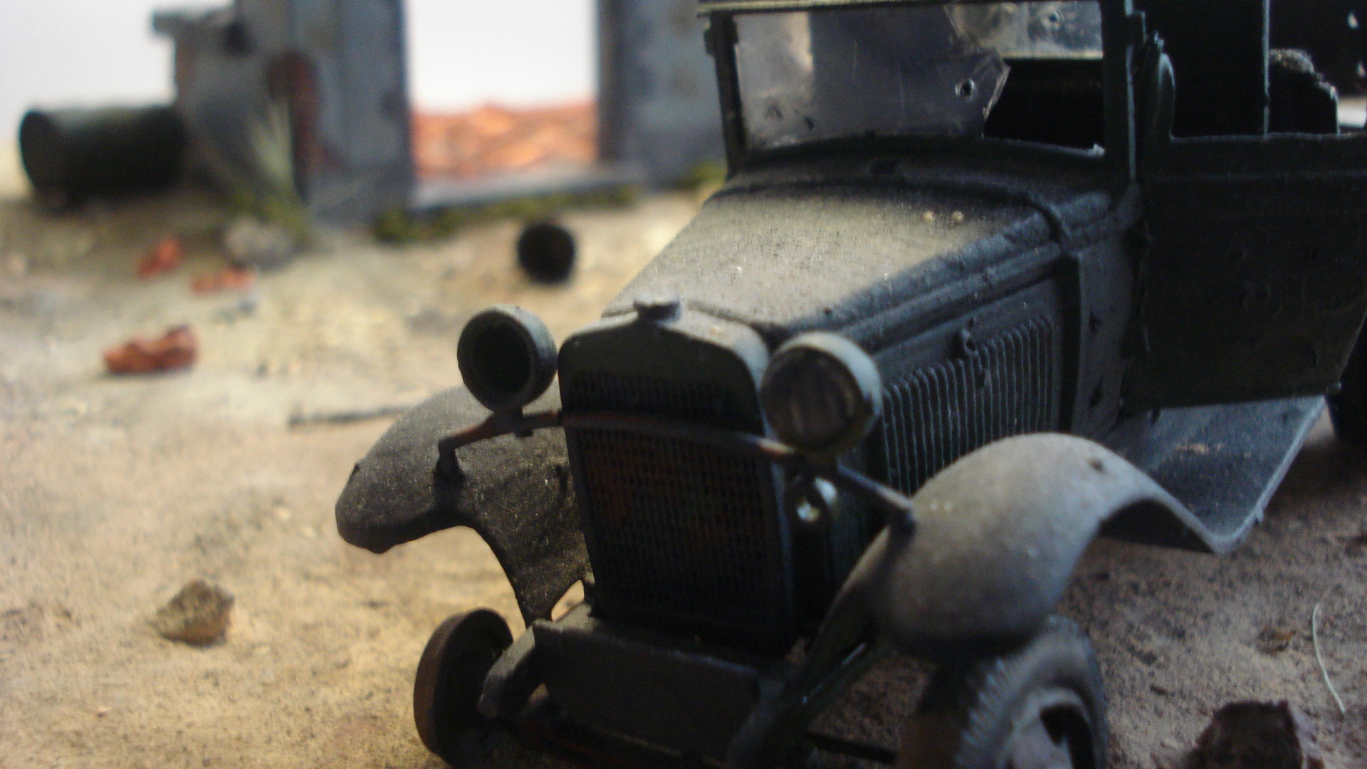 диорама была сделана 2 года назад,на тот момент мне было 13лет.в работе использовались фигуры dragon,полуторка от звезды,бочки и ведро-тамия,окрашивалось акрилом звезды.основание-гипс.битый кирпич-крошеный гипс.жду справедливых комментариев.