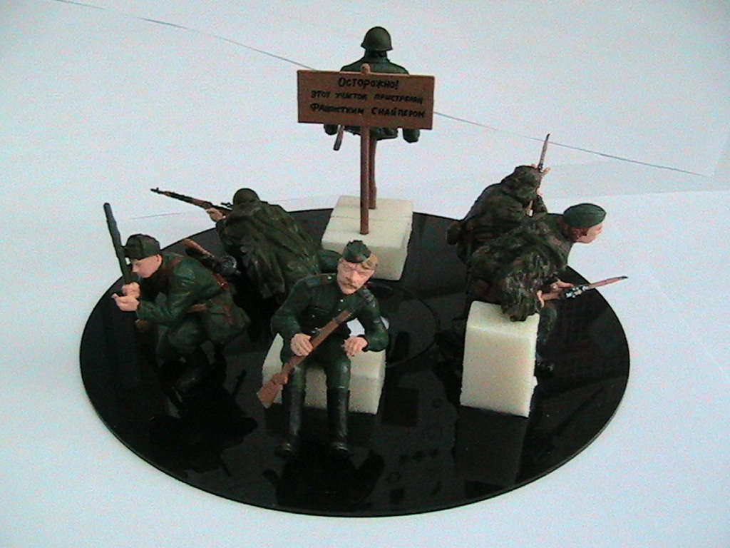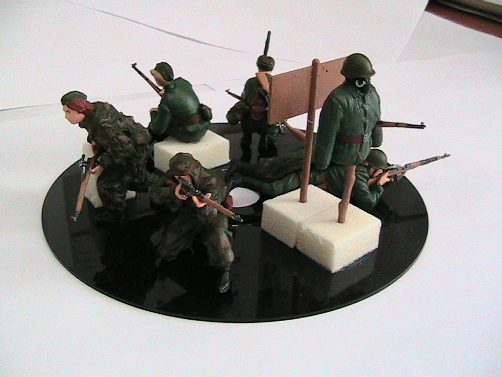 фигурок набрал на диараму "Оборона госпиталя" и задумка была поставить рядом ещё один дом двухэтажный- комендатуру, расположить там снайперов. однако в последний момент передумал и расположил в "Обороне госпиталя" с тыльной части здания Зис-5в , санитаров , группу прикрытия из снайперов. Между зданиями ещё пушечный расчет должен был стоять. Диараму "Оборона госпиталя " скомкал конечно, но иначе она ни в какие ворота не вошла бы...