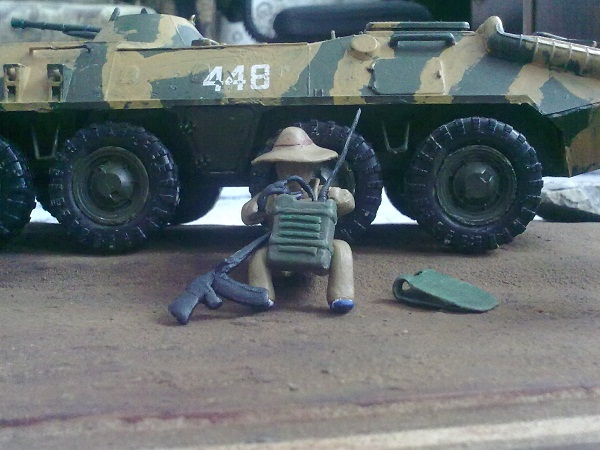 Представляю вашему вниманию мою давнюю работу.Это моя первая диорама, называется "Огонь!"Сюжет довольно прост: Афганистан, колонна русских солдат, засада, "духи" как всегда на скалах. Наши быстро соскачили с брони и открыли ответный огонь. Лепил из пластилина, БТР "звёздовский" был собран по частям( в детстве успел его подраздолбать