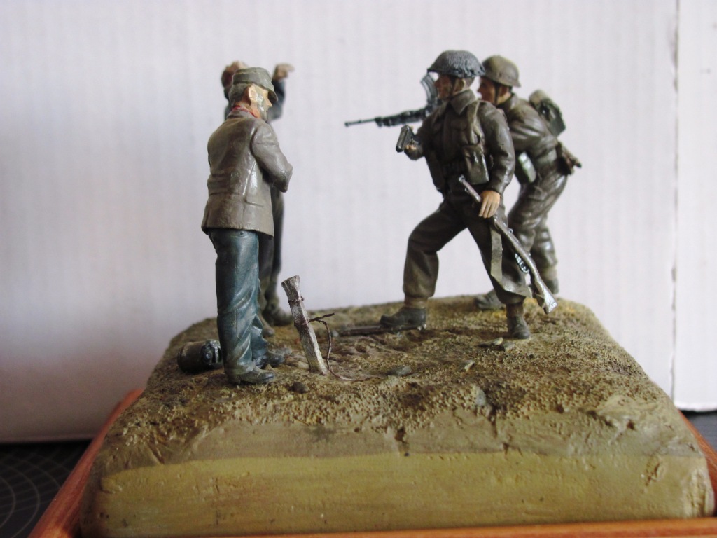 Несовсем понятно из-за разделяющего фигурки расстояния.Если бы бриту коснуться немца рукой то многое прояснится. Тогда и поза немца более понятна: он как-бы немного дёрнулся при касании - вдруг вдарят? И подставку надо ужать, а то правда много пустого места. Было бы более понятно что Томии берёт Ганса в плен.