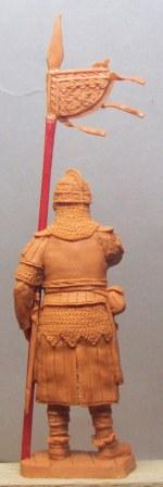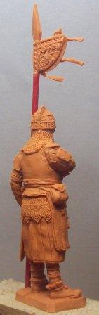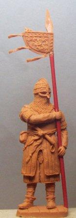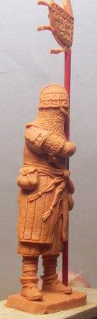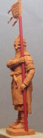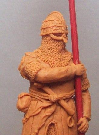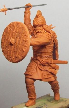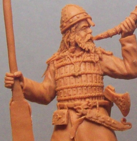 Еще один викинг 54мм. Тем,кто будет уверять,что рогов на их шлемах не было-отвечаю,были.Скудность источников не дает возможности понять,ритуальные ли они были или применялись в бою.Целесообразность часто уступала место верованиям и фактору устрашения.Так или иначе,но Дзысь в своих реконструкциях пользуется еще более сомнительными источниками-иконами,писавшимися под влиянием канонов иконописания,поэтому его русичи напоминают византийцев и никого это особо не раздражает.