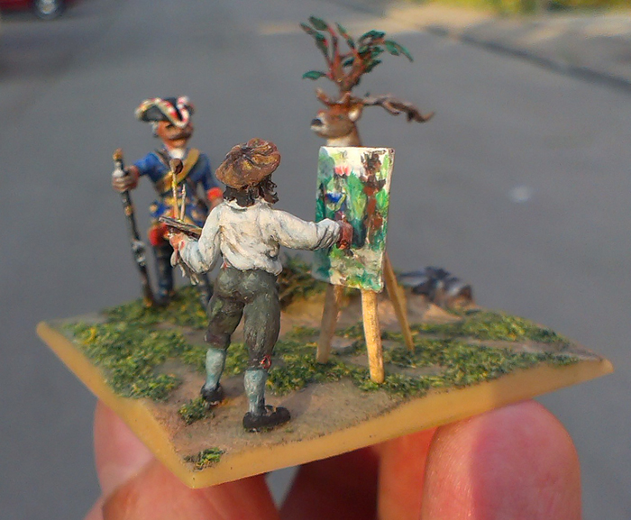 Отличный образец "мирного творчества" в жанре военной миниатюры! Очень нравится. 72-й масштаб опять же - не для слабых духом! Но сюжет автор по-моему не совсем правильно озвучил. Барон здесь не на охоте, т.к. у оленя уже выросло вишневое деревце. На охоте он был раньше, а здесь, специально взяв художника, надев свой "Специальный Охотничий Мундир" с золотыми позументами, напудрив парик и заранее договорившись с оленем, пошел позировать для истории
