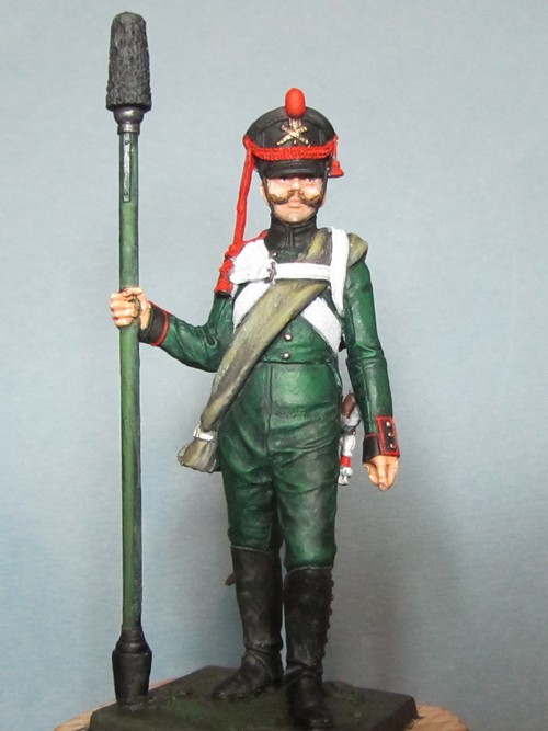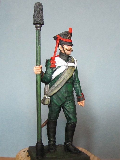 Раз выпушку н вороте исправили о ее пропускаем, но кожаная петлица на кивере должна быть черного цвета. Клапаны рукавов должны быть зелеными и выпушка вокруг них неверно показана. Ну и пуговицы на крагах надо окрасить