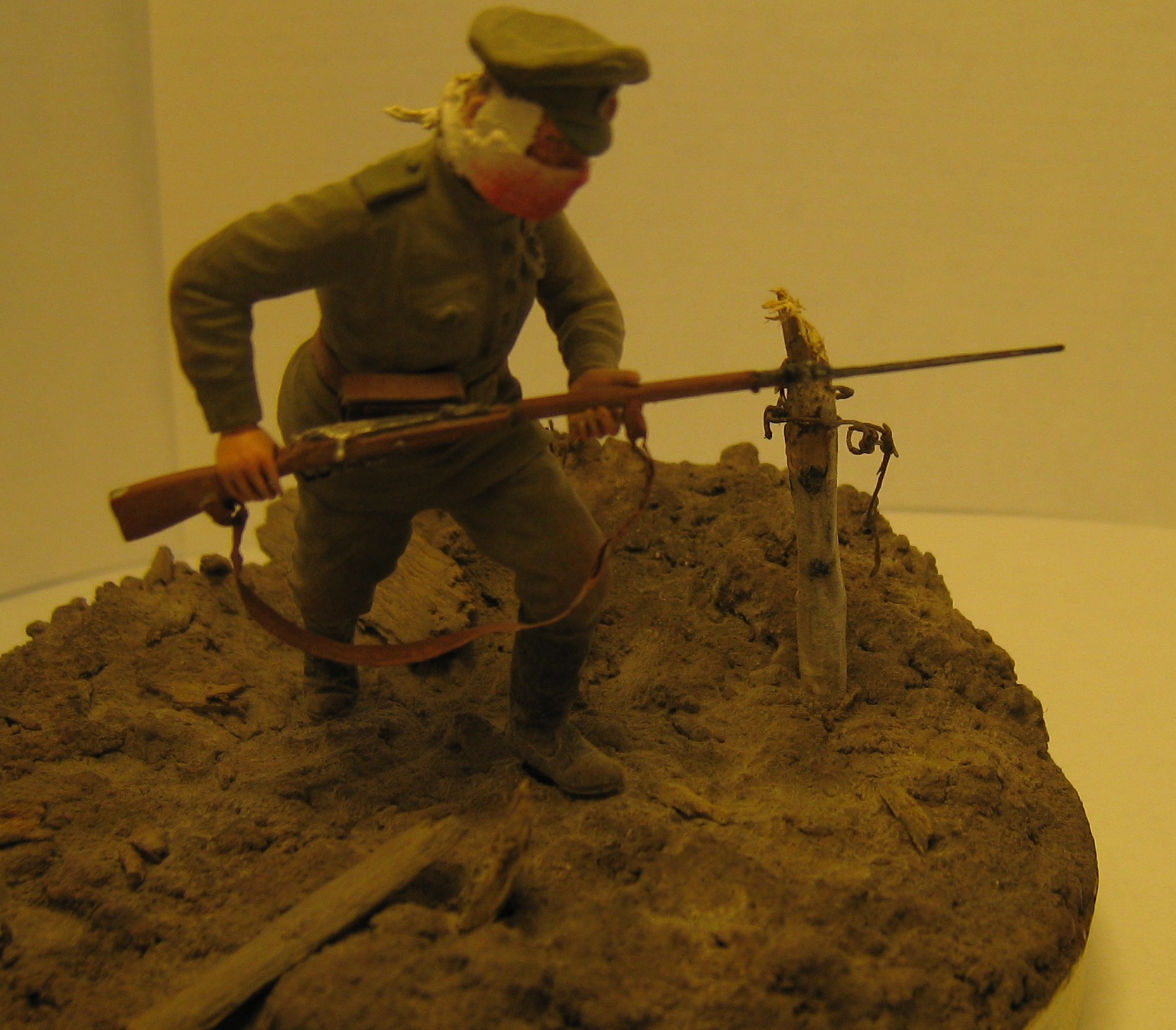 Добрый день! Представляю вашему вниманию работу на тему "Атака мертвецов".Очень давно хотел сделать эту виньетку ,перерыл всё что мог , но к сожалению информации крайне мало. Даже не думал , что закончу её как раз к столетию этого события. Солдат фирмы Мастерклуб(точнее его конверсия) - руки взял из набора русской пехоты фирмы ICM и добавил марлевую повязку. Краски: АКАН, Тамия, акрил от Звезды. Основание - алебастр,шпатлёвка по дереву, всякие камешки и песок со двора, даже поперчил и посолил(в прямом смысле).