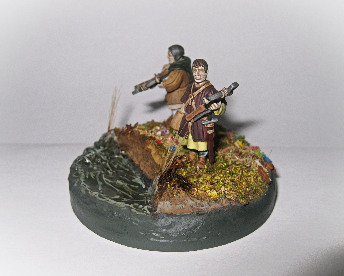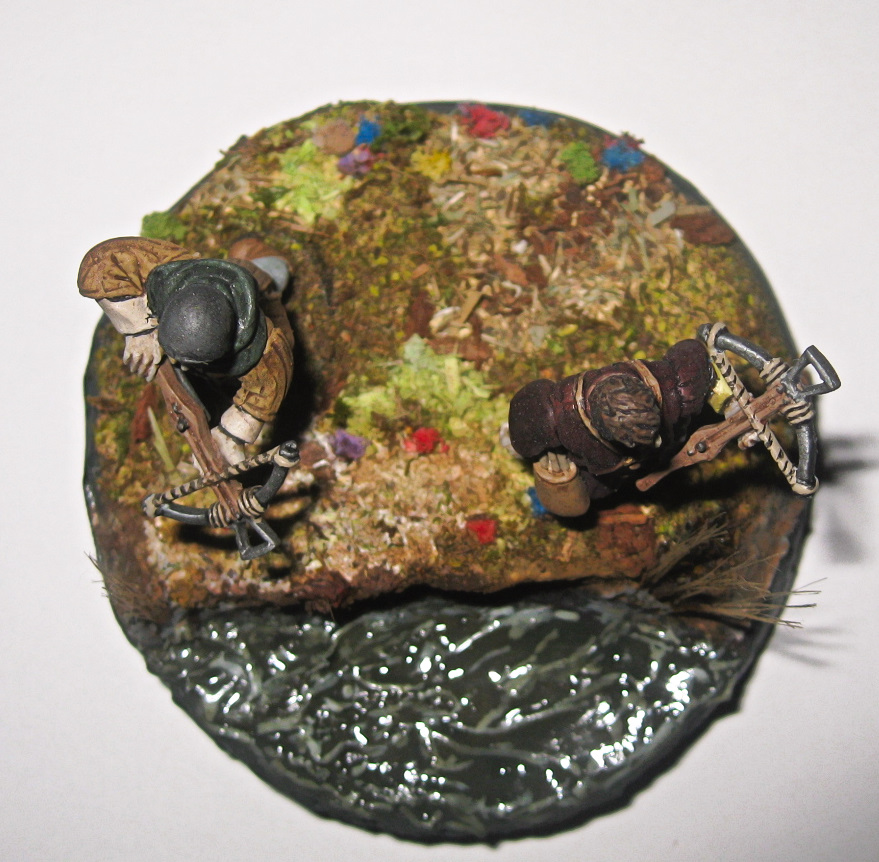 Вот такая вот виньетка. Использованы два арбалетчика из набора "Драбанта". Воду делал первый раз. Использовал жидкое стекло, но результатом не особенно доволен, пришлось водичку по разукрашивать в силу способностей.