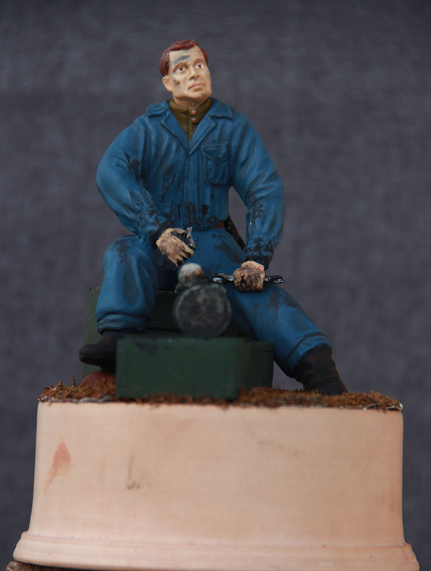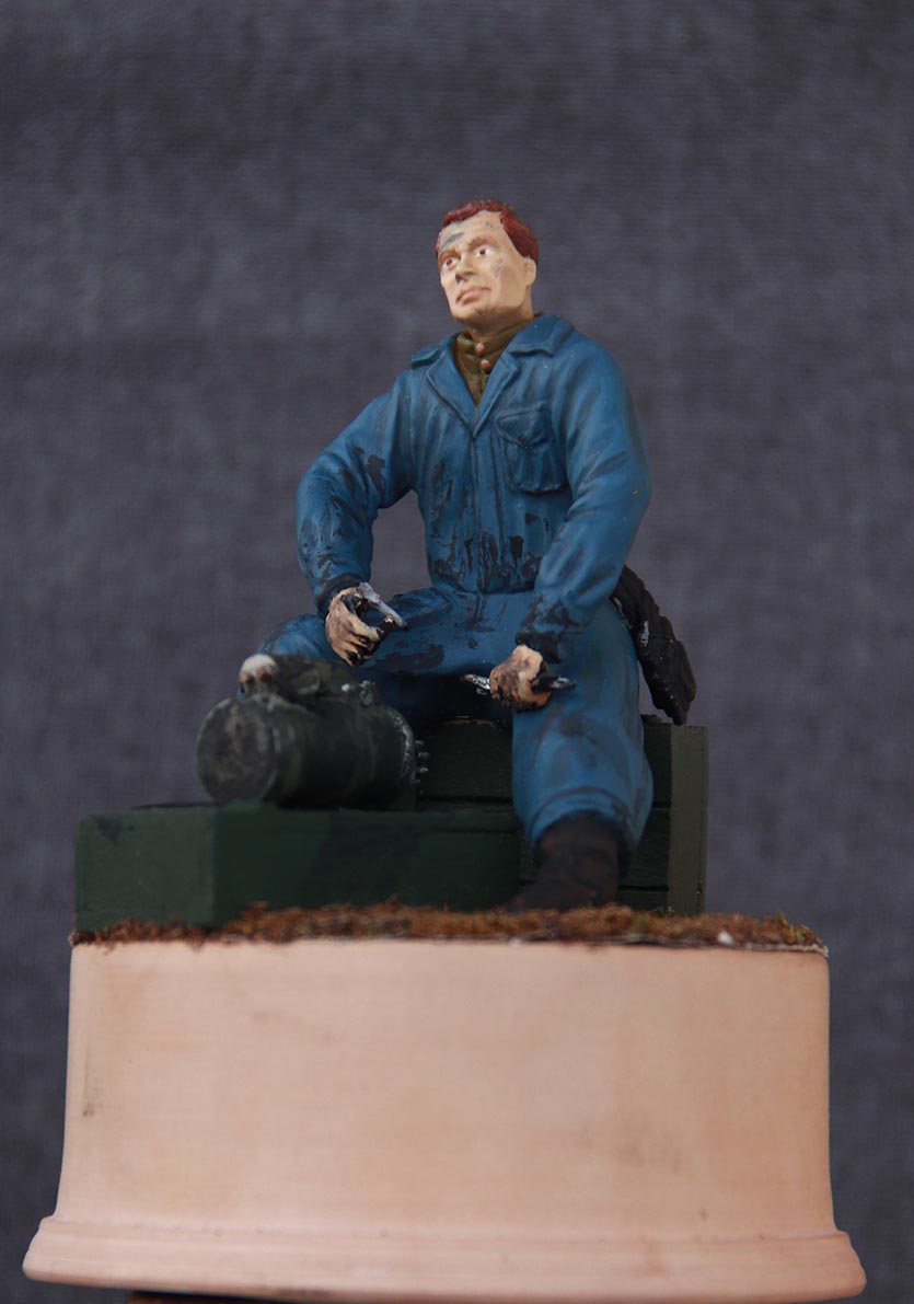 Фигура из эпокселина голова 5,45 окрашен темперой. Масштаб 1/16 стартерделал сам тоже из эпокселина ящики палочки от мороженного.Трава мох. Подставка- груша.(прикупил токарный станок теперь подставки делаю сам)