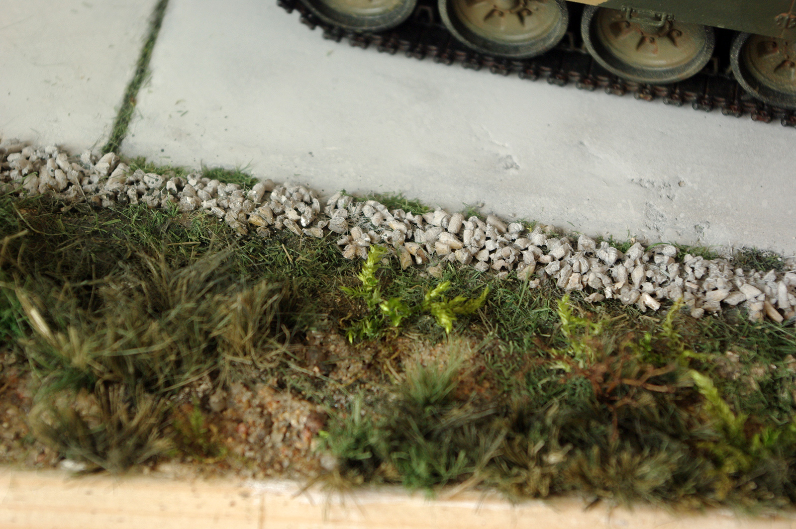 Задумка была проста - изобразить современный танк т-90 на полигоне, как вариант на танковом биатлоне, поэтому легкая пыль и грязь на нем, и стоит он на бетонных плитах. Модель взята из коробки Звезда, только антенна и тросы заменены на садельные. Краска Тамия, матовый лак и смывка из масляной краски Сонет. Хотелось попробовать создать диараму, поэтому сразу за сложное не брался - выбрал бетонные плиты и кусок травы.