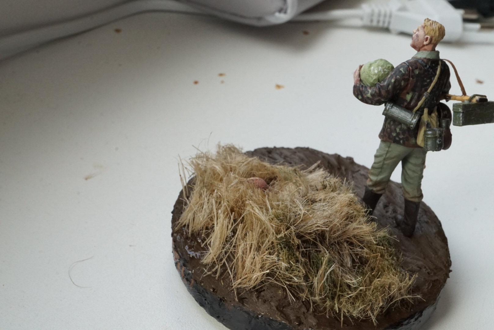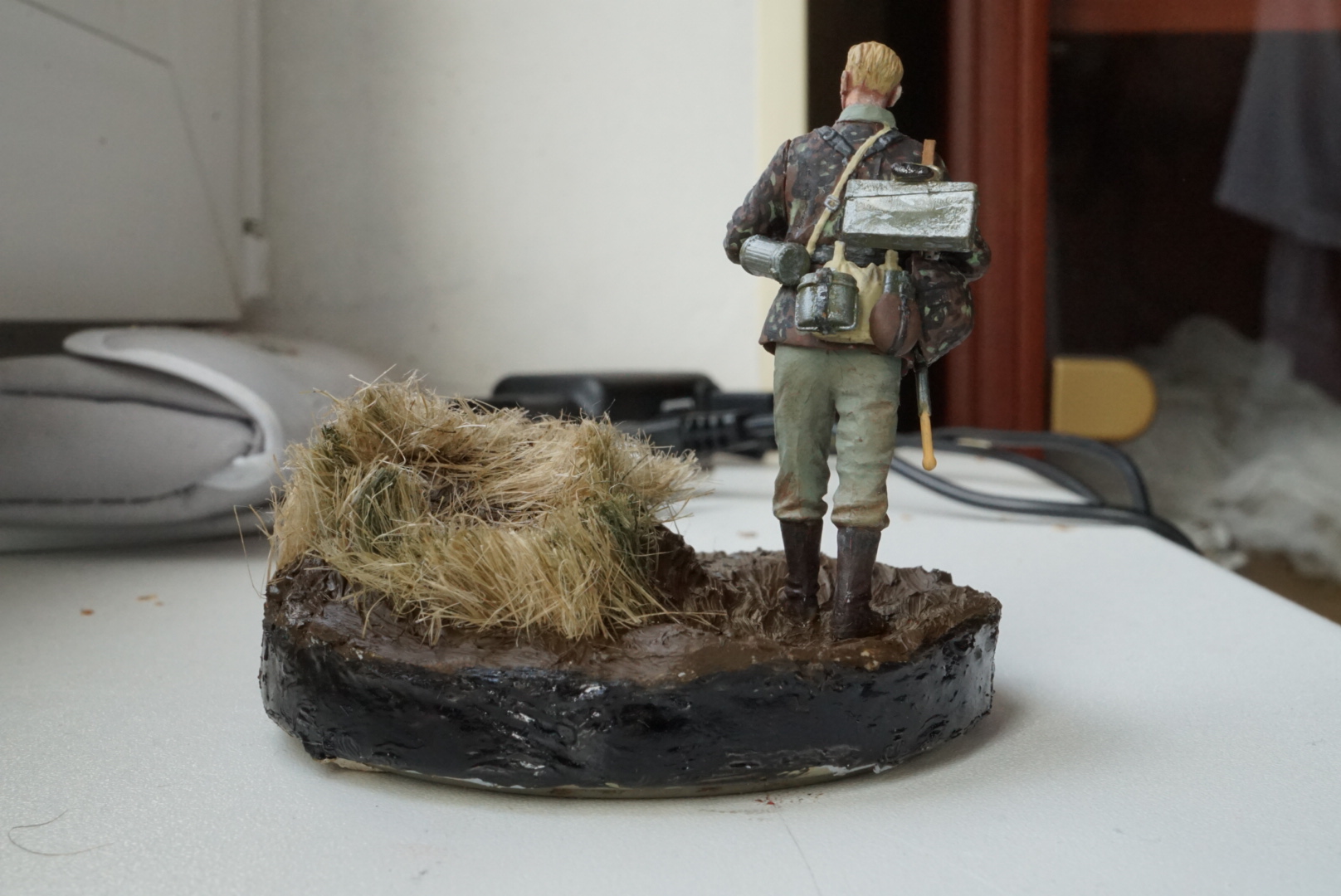 Фигурка - MasterBox, каска в траве - тоже. Основание самодельное, из гипса, трава - пакля, грязь - масляные краски. Фигурка окрашена в основном красками Lifecolor, фрагментарно Tamiya (металлическое снаряжение), лицо и руки - AK Interactive, каска окрашена красками и пигментами Lifecolor.