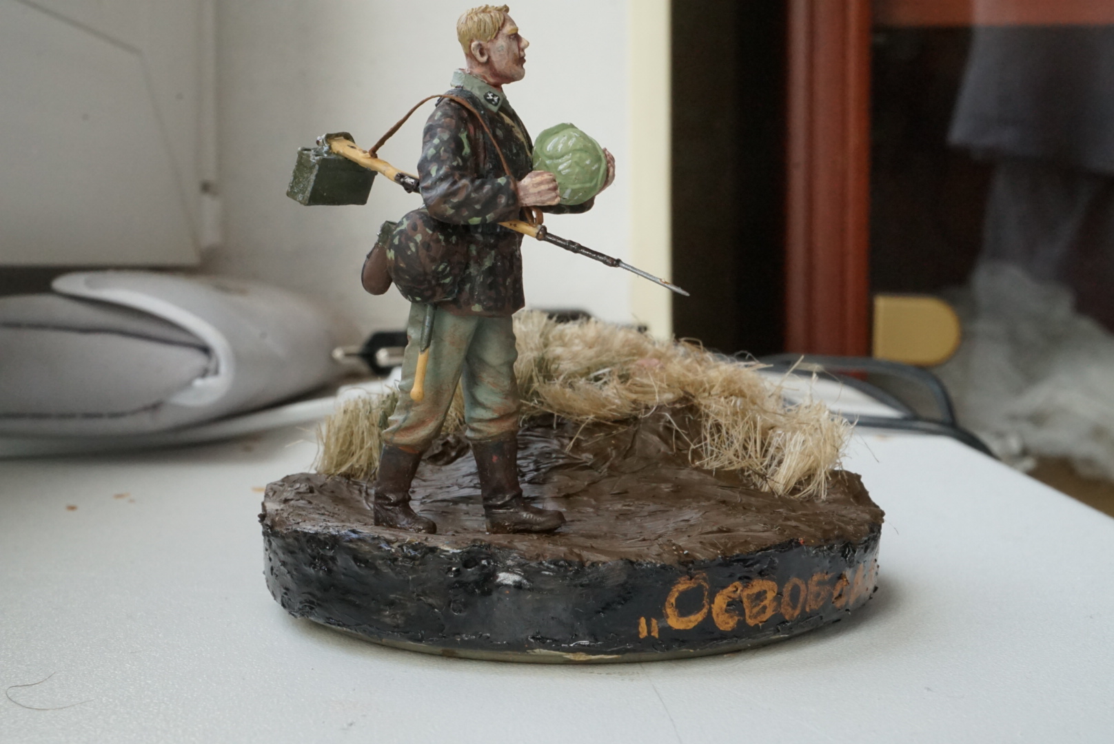 Молодец,что выставили работу,не стушевались.Сам помню,как с щенящей радостью показывал первые покрашенные фигурки друзьям,те крутили у виска-не их тема.Могу дать несколько советов на будущее.Любую работу встречают по одежке,поэтому выбирайте основание для солдатика поменьше,но делайте аккуратней.Всякие камуфляжи,узоры и"шотландки"оставьте на потом,когда руку набьете.Немецкий камуфляж смотрится эффектно,когда он правильно и масштабно прорисован.Как расписывать лица,посмотрите на сайте(статей много).Вместо грязи сажайте больше травки разных оттенков и сухих пигментов.Классно получился качан капусты,но надо пролить темными смывками,чтобы листы дали рельеф.Дальнейших успехов!