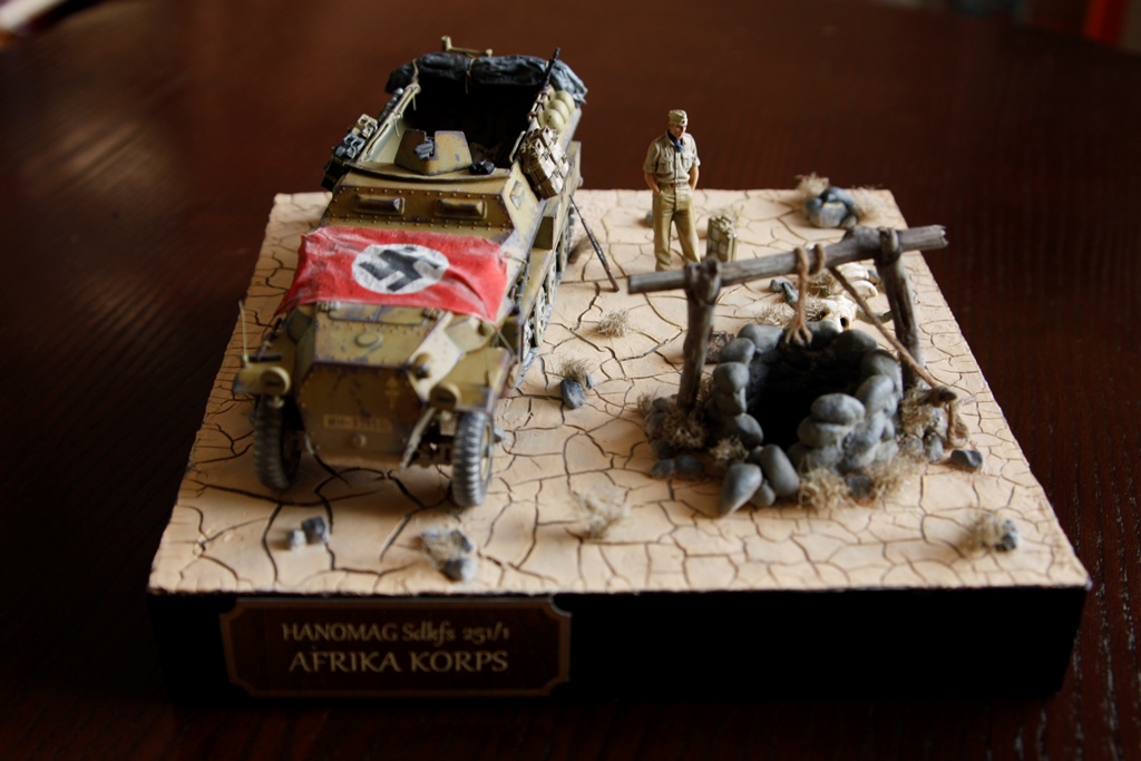Модель "TAMIYA" Hanomag Sdkfz 251/1. Окрашивалась акрил "TAMIYA", Флаг и Скатки из бумажных одноразовых полотенец+ клей ПВА, Трещины на диораме- Паста кракелюрная двухкомпонентная. Трава- лён сантехнический. Колодец, камни, скелет - слеплены из Керапласта "KOH-I-NOOR" и окрашены акрилом "TAMIYA". Модель миниатюры "Alpine" окрашивалась акрил "TAMIYA" и темпера "Мастер класс".