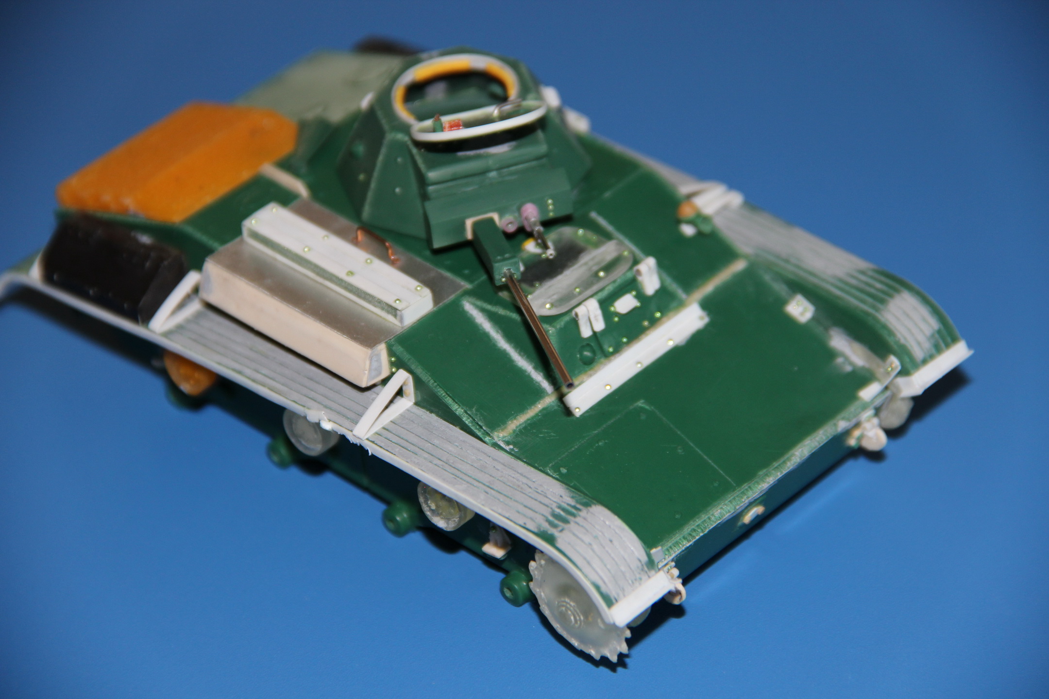 Древняя модель Т-60 от Звезды лежала несобранной лет 20. Выбрасывать конечно жаль, решил довести ее до ума подручными способами. Изначально планировал просто густо засыпать весь танк снегом, спрятав под ним все косяки (была как-то такая виньетка на Диораме и ее же фото в М-Хобби), но в процессе втянулся и вошел во вкус запиливания. Из афтемаркета пришлось приобрести смоляные гусеницы от Мастерклуба, поскольку сделать гусеницы самостоятельно задача фантастическая. Надо сказать, что с гусянкой сильно намучился (собранные в звенья по 10-12 траков они искривляются по дуге, защелки держат плохо), но возможная альтернатива в виде металла от Фриул даже не рассматривалась из-за непомерной стоимости. Также с достаточной долей условности афтемаркетом можно назвать смоляные ящики ЗиП и надмоторную решетку от пензенского Танкомастера, хранившиеся все это время вместе с базовым набором. Знаю, что у них неверна форма петель и нет имитации барашков, но все-таки оставил эти детали. Геометрия корпуса и башни не исправлялась, были исправлены лишь крупные косяки, бросающиеся в глаза: надмоторные решетки, короб воздухозаборника (доширак, фольга, сеточка от чайного пакетика), люки мехвода (пластик из упаковки от CD дисков). Косынки, уголки, петли люков, буксирные крюки – из доширака и фольги. Заглушки пистолетных портов выточены из литника. Орудие – игла от шприца, ДТ – тоже из иглы, обернутой полосками фольги-самоклейки. Заклепки – микробисер, головки болтов – тянутый шестигранный литник. Клаксон – из литника и доширака, фара – полностью самодельная. Надгусеничные полки оставил родные, но сточил неверный рельеф и нарезал новый, закраины – доширак. Ну и «ведро шпаклевки». Сварные швы имитировал всеми возможными способами – из шпаклевки, из тянутого литника и просто нарезанные модельным ножом. Катки – самодельные смоляные копии от СУ-76 (Алан), кожухи бортовых редукторов и ведущие звездочки тоже, но доработанные «с помощью напильника и мата». Шанцевый инструмент и домкрат – смоляные копии с разных наборов. Буксирный трос – из обычного медного электропровода ШВВП.