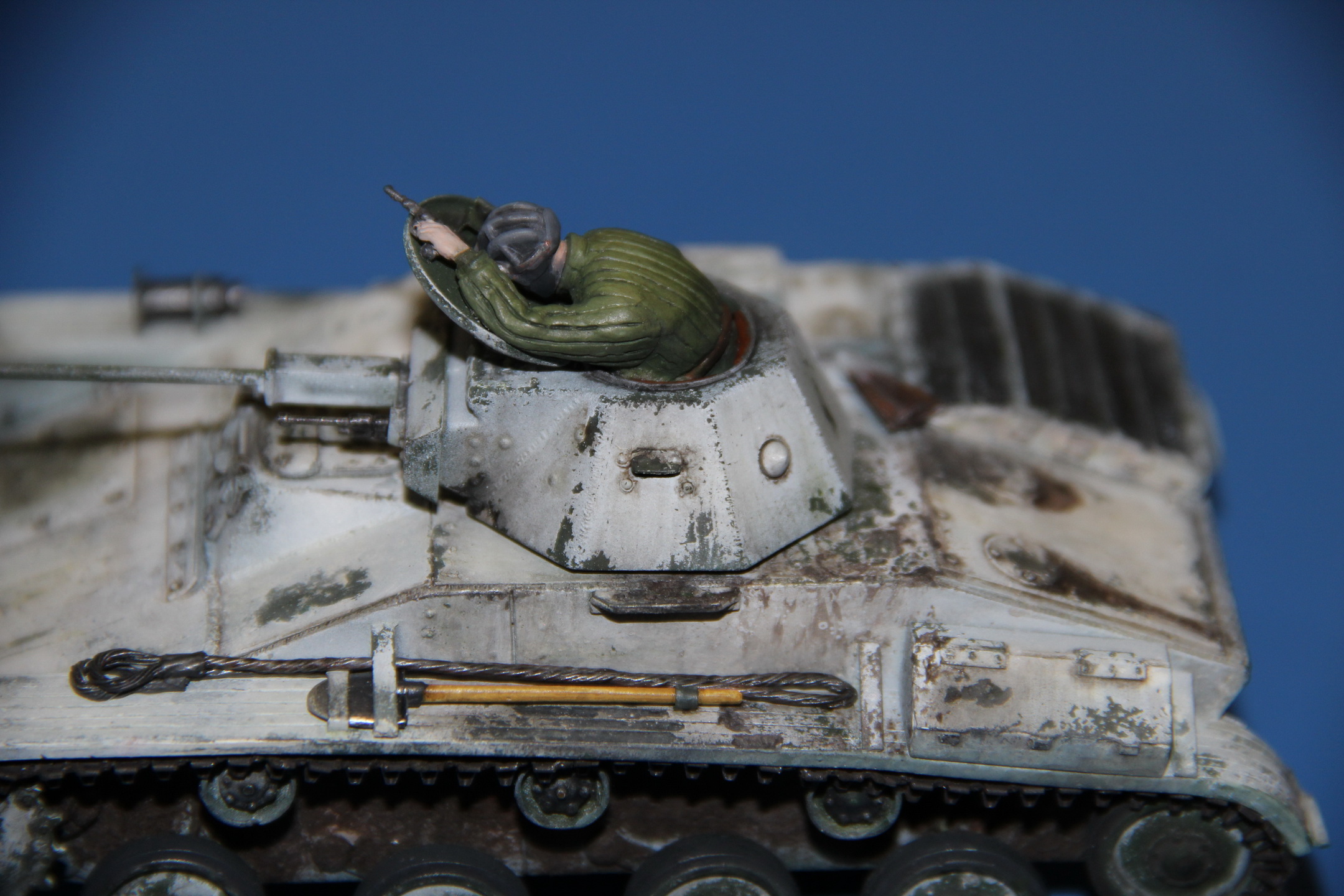 Интерьер делать не планировал, но поскольку подбитые танки имеют, как правило, открытые люки, то пришлось внедрить фигурку погибшего танкиста чтобы закрыть зияющую пустоту (так что это ни в коей мере ни есть самоцель изображения убитых на диораме). Тело – самоходчик от Миниарта, голова – Звездинский танкист, револьвер – Мастербокс (контратака).