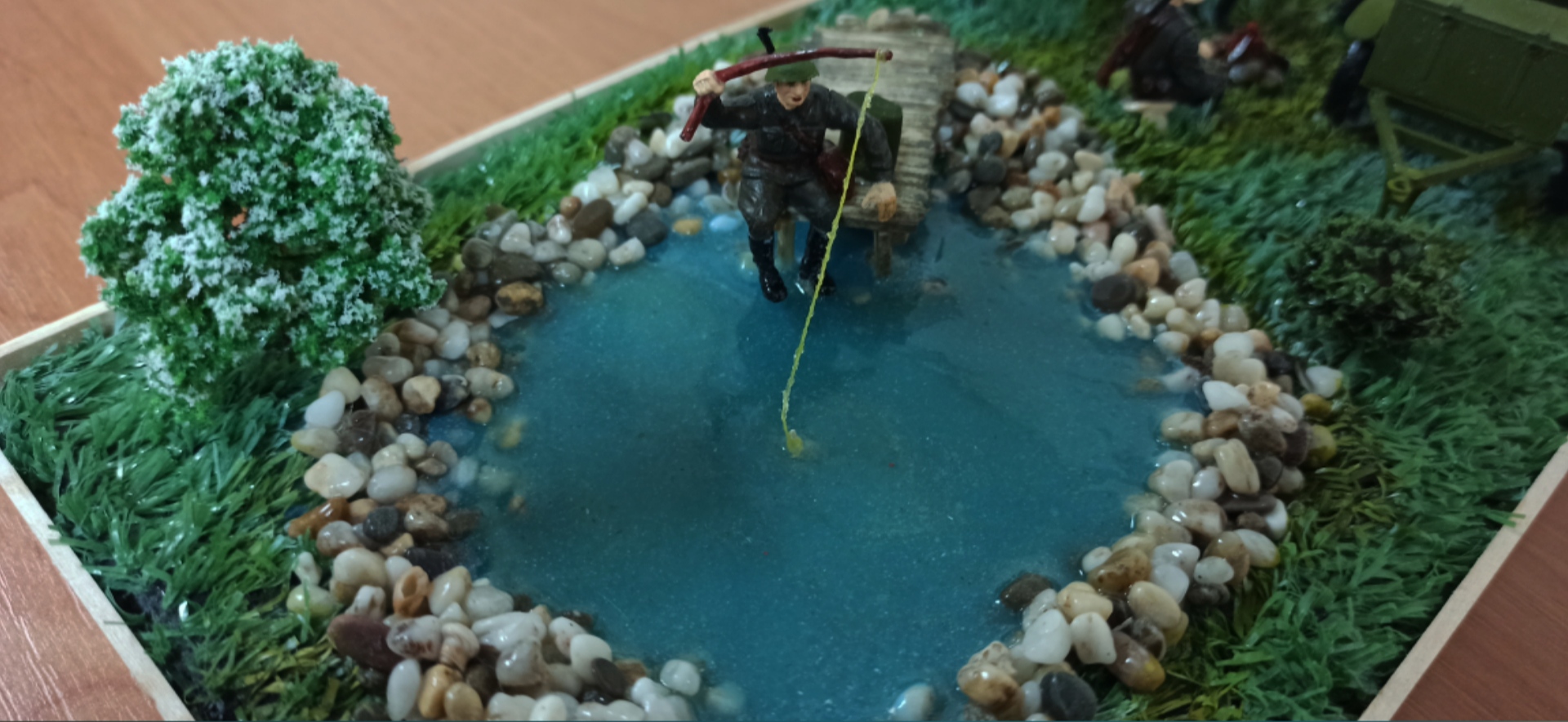 Не ловят рыбу в джакузи! Да, именно джакузи у Вас получилось - хоть и дизайнерское, обложенное искусственным камнем. Натуральные камни на диораме 1:35 (не говоря уже про более мелкие масштабы) выглядят НЕ натурально: их текстура оказывается не масштабной и смотрится нарочито. К тому же размер: при пересчёте в масштаб это получаются полуметрового размера валуны. По возможности избегайте использования натуральных материалов: они слишком узнаваемы. Да и где Вы видели берег естественного водоёма, заботливо обложенный валиком камней, возвышающимся над окружающим ландшафтом? Берег должен идти вверх по мере удаления от уреза воды.