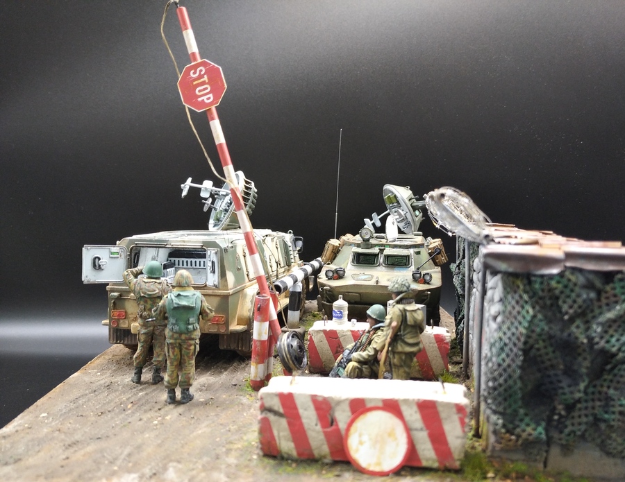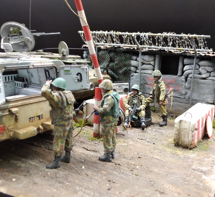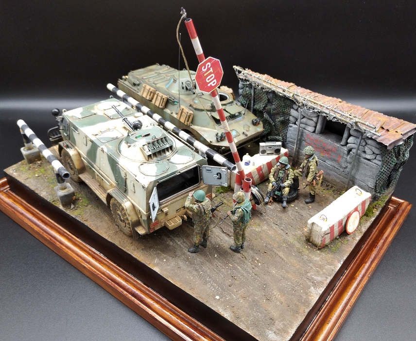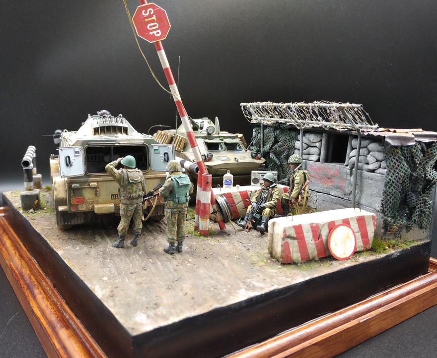 Давным давно хотел сделать что-нибудь из темы на вторую чеченскую, в коей довелось поучаствовать командировками в ЧР. Сначала была мысль сделать ПВД в Гудере по своим фото с "Бардаком" (БРДМ),потом зашла тема с "Водником" ( бронеавтомобиль) в Ханкале. И в один прекрасный момент решил обе темы объединить в одну с композицией блокпоста,коими были утыканы все дороги тогдашней Чечни. Собственно, так и возник этот "Райский уголок" где-то в районе Герзельского моста. Жизнь на блокпостах кипела полным ходом, дневной зной менялся ночным диким холодом, обстрелы,провокации,досуг: кто во что горазд...ну и конечно, работа,работа... Проезжавший мимо "чудоавтомобиль" или как говорят,"коробочка", вызвал неподдельный интерес у обитателей поста.