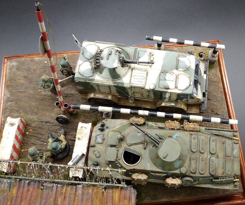 Помимо наборов моделей и фигурок для создания диорамы использовал пеноплекс,акриловую шпатлевку. Из полимерной глины изготовлены бетонные блоки и мешки объекта,которые масштабированы по стандартам ГОСТ. В работе использовал фототравление от "Микродизайна",мелочевку от ДМС и вязальные спицы для изготовления ограждений и шлагбаума. Окрашивал всё акрилом разных производителей и маслом. Обе машины деталированы внутри,поэтому сделал фото со снятыми башнями тоже.