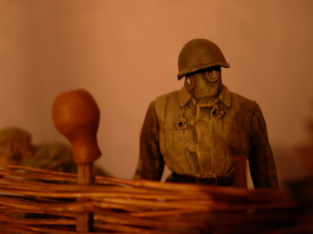 Хочу выставить на форум несколько фото виньетки ,, Вдвоем с братишкой,, Фигурка снайпера и ,,братишки,, – от ,,Звезды,, . Основание – гипс. Трава – пакля и сухоцвет. Плетень – веточки, надерганные из веника. Подсолнух – проволока, бумага. Окрашено все эмалями Хамброл. Сделана виньетка полгода назад. Но сфоткал ее недавно. Жду ваших отзывов!!!