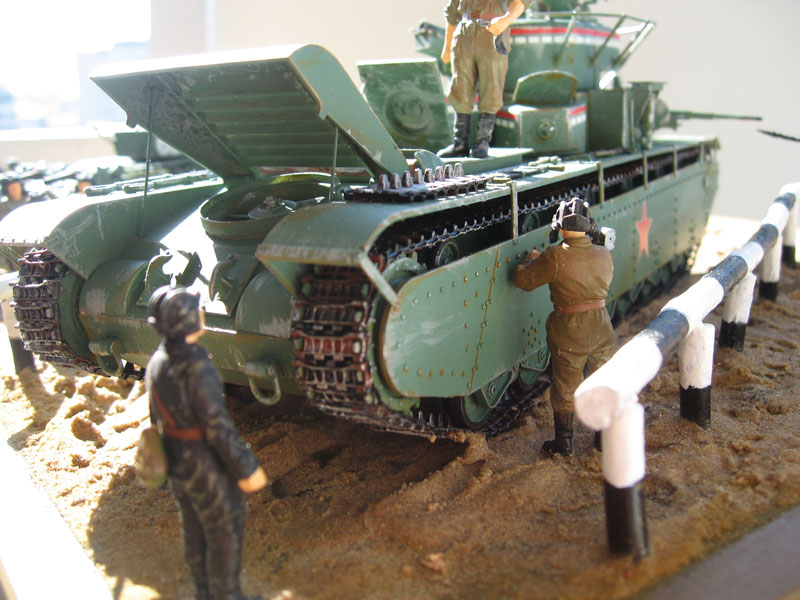 Тема такая - "танки после маневрев". Стоят в полевых условиях, травки нет, потому что все "перемолото" гусеницами. Если у БТ и Т-18 есть героическая история, то к сожелению у Т-35-го в основном трагическая.Как я прочел на одном сайте (ссылку пришлу как нибудь), то в первый период ВОВ их было подбито всего 4 штуки из 60-65 имеющихся.Остальные танки были брошены или взорваны экипажами всвязи с техническими проблемами (то вышел из строя откатный механизм гл. пушки, то у башни что-то, то из-за массы танк завяз в грязи, перевернулся и т.д.).