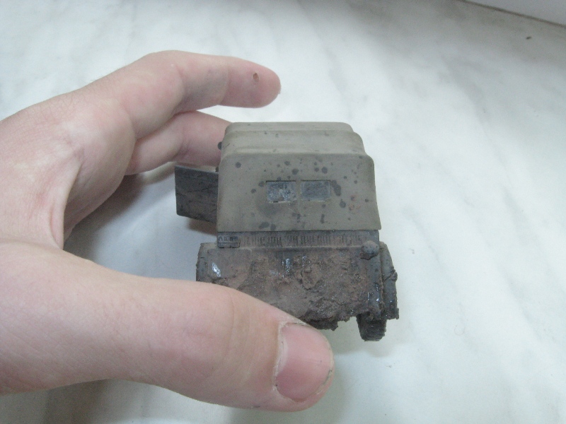Грязи теперь многовато- после такого "залёта" он ехал бы только на буксире. На самом деле, большие комья сами отваливаются. Поэтому не стоит увлекаться объёмом. Значит, так: пороги ничего, но ели грязюка поддаётся удалению, я бы слегка убрал. На морде слишком крупные куски планеты застряли, тоже можно уменьшить. Задница, в принципе, больше пылится, чем закидывается. Посему пыль я бы распределил следующим образом: максимальное количество ниже середины двери, выше- по убывающей. И если лобовуха крашена акрилом, ватной палочкой бы протёр его, типа водитель это сделал. Кстати, если будешь пылить, пыли и верхнюю часть грязи- внизу она влагу держит, высыхает сверху вниз. Причём ещё сырые фрагменты просто темнее, можно запустить в пыль жидкую масляную краску потемнее, разведя её уайт-спиритом. Так же делаются пятна масла и топлива. Но может быть и показанный вариант, одно но- уместно кубель будет смотреться свежевыволоченным из, скажем, канавы, куда нырнул водитель, спасаясь от обстрела.