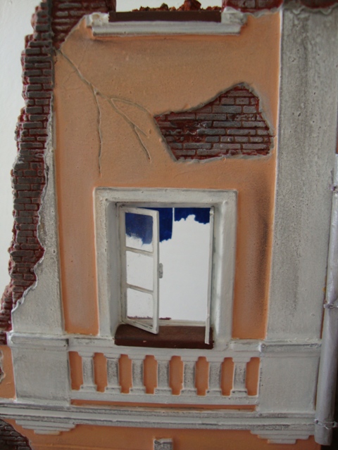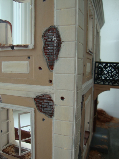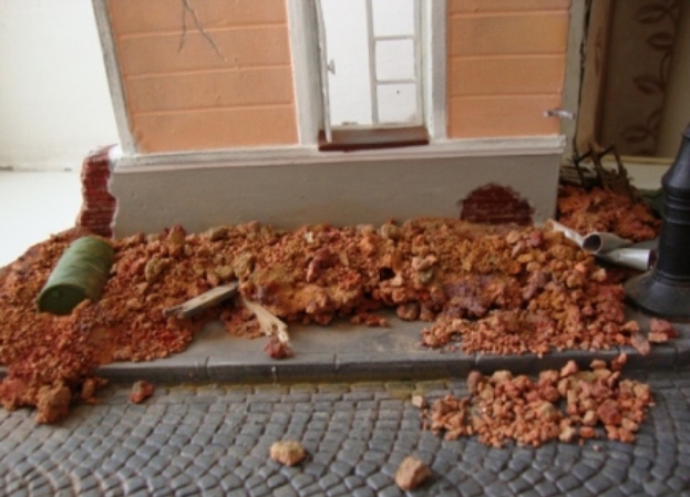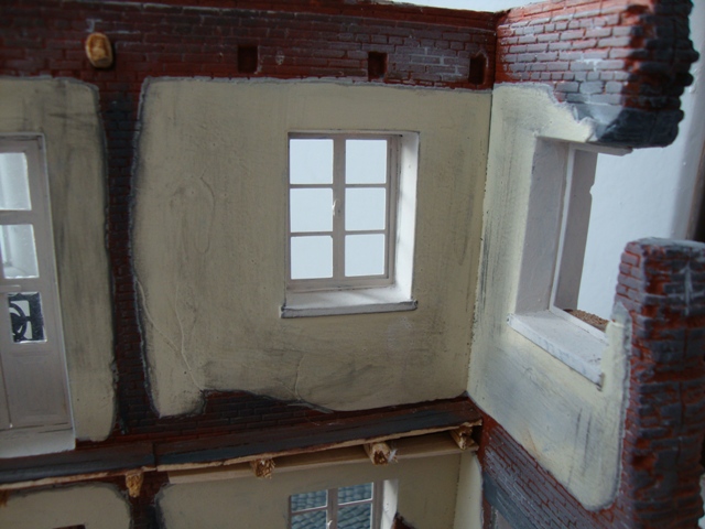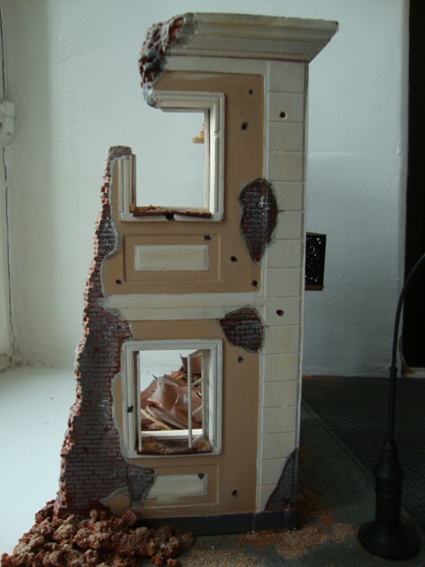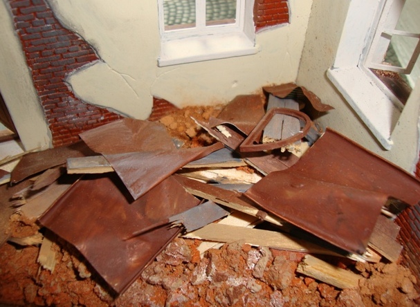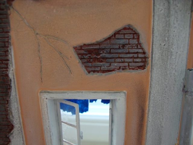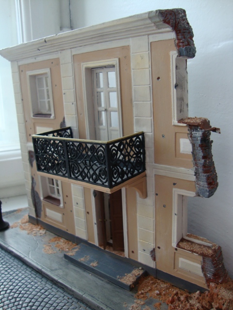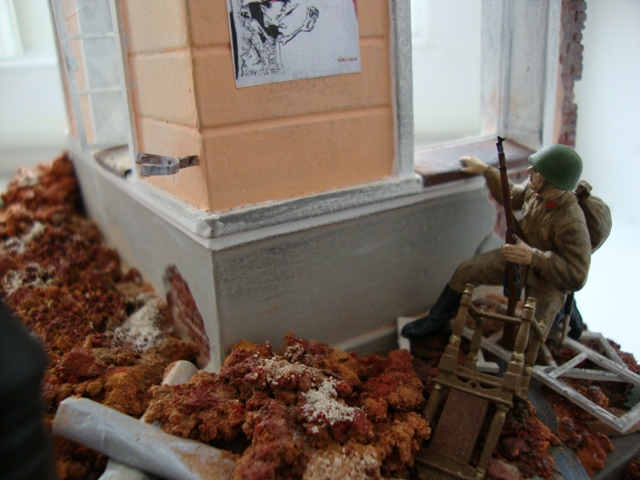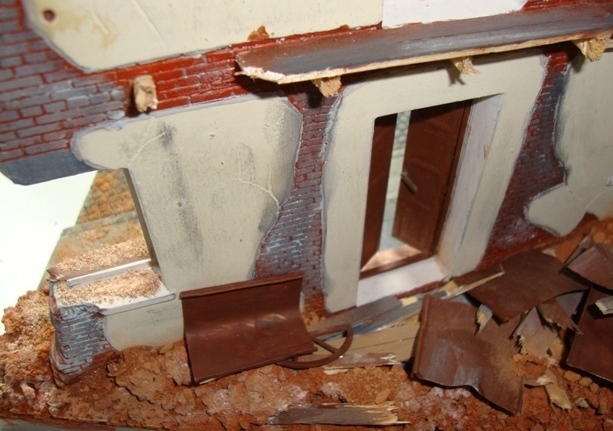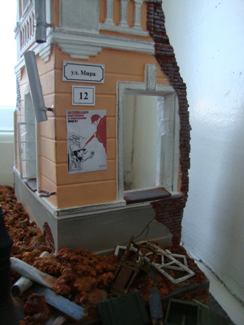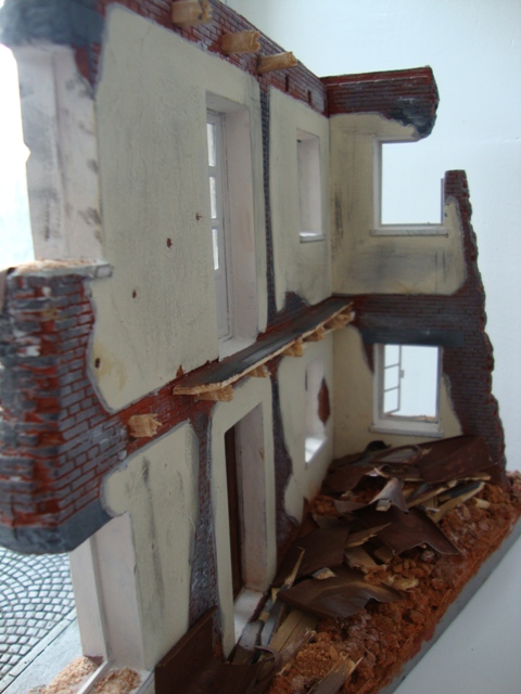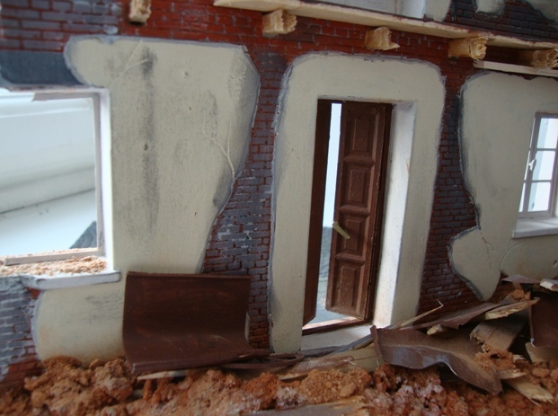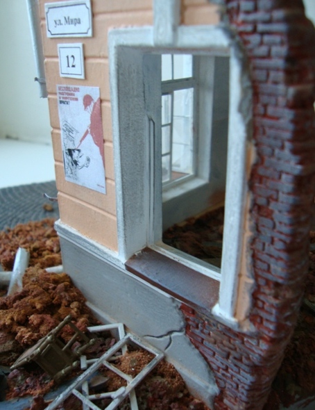Соглашусь с ранее сказаным, стены домов слишком чисты как для уличного боя. С наружной стороны не помешало бы следов пуль, осколков, трещин (так как судя по разрушениям в дом (или где-то рядом) упала авиабомба. На стенах (в местах где отбита штукатурка) кирпич можно сделать на несколько оттенков, не всегда его использовали строго одного цвета. И не исключается версия пожара после авиа налета, т.е. закопченности, следы сажи над рамами, ну и как следствие внутренняя часть домов (квартиры).