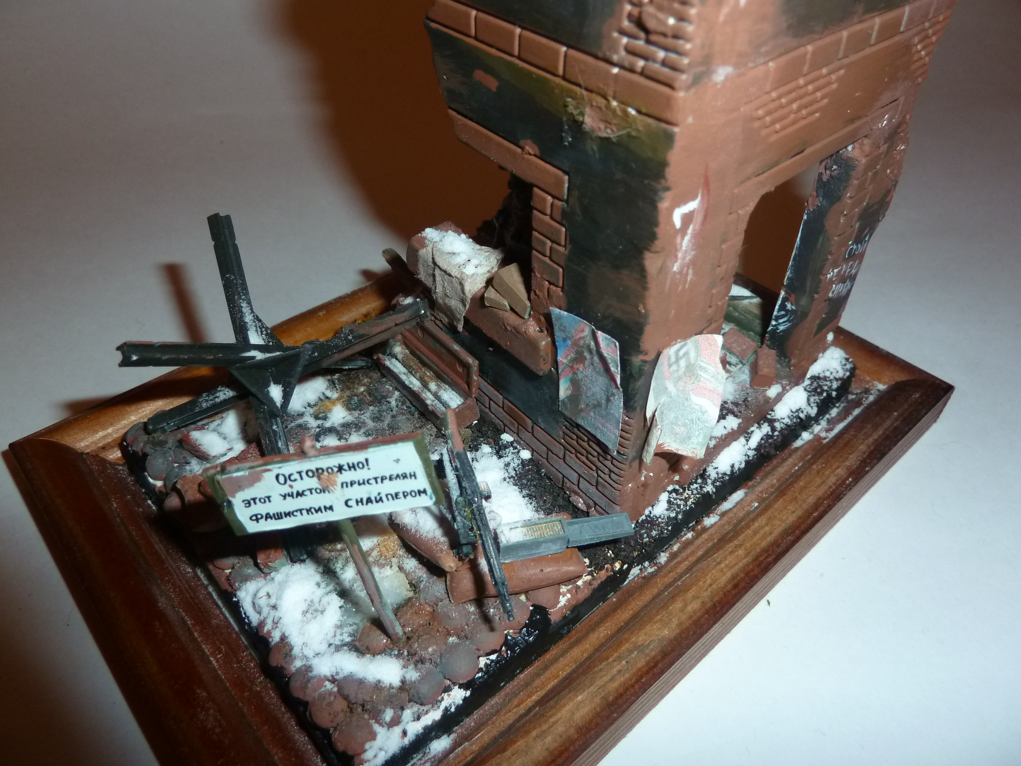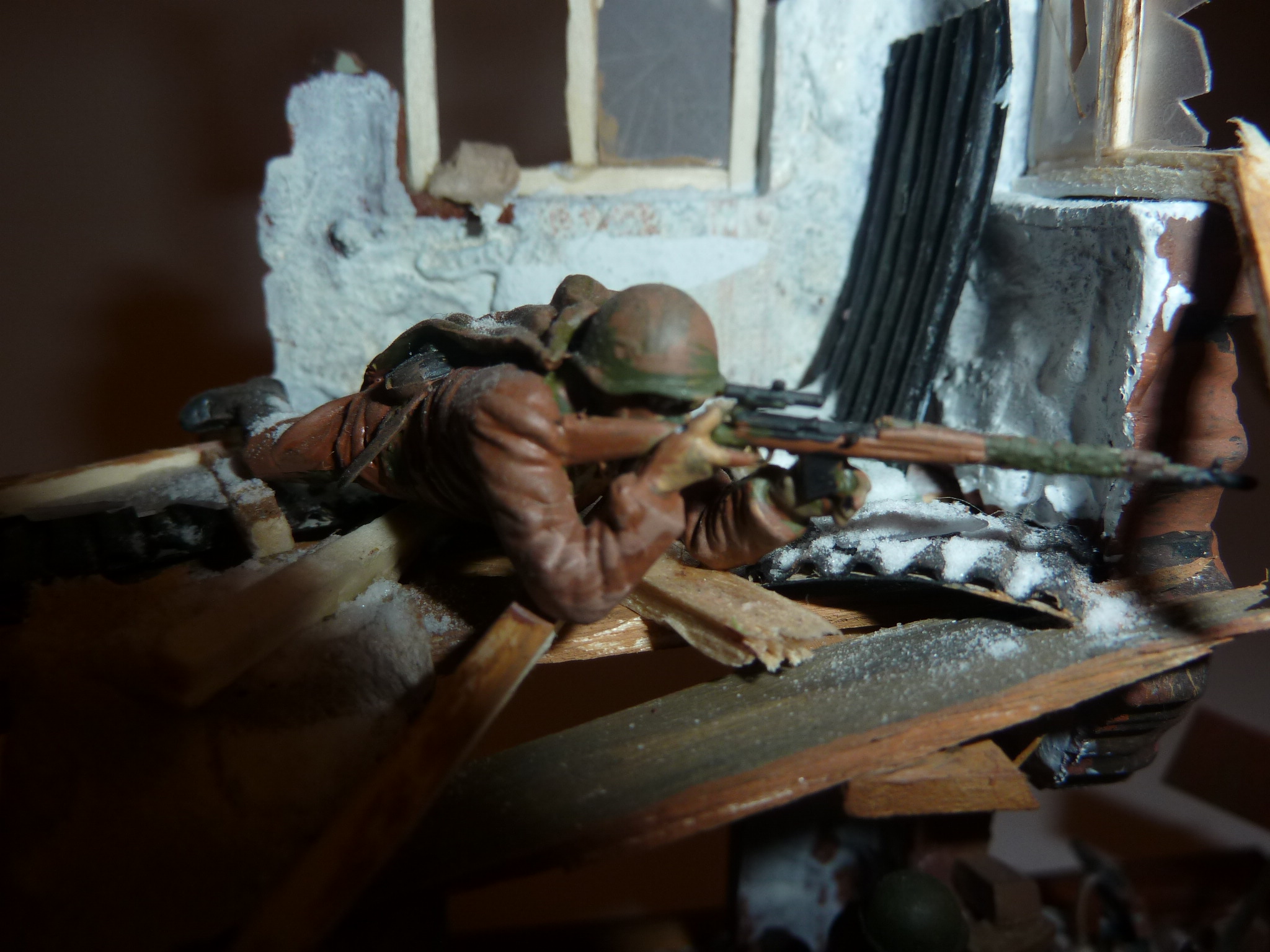 Наконец доделал старую задумку.Для работы взял старые фигурки фирмы ZVEZDA (советские снайперы). Красил всё акрилом ZVEZDA включая и саму диораму .(ОСНОВАНИЕ)Фоторамка.Отливал форму из гипса,брусчатку выкладывал из гороха половинками как из статьи "На улицах Харькова "щели между ними засыпал песком,под зданием основу высыпал из чайной заварки. Снег сода+пва.Лужицы эпоксидная смола.(ЗДАНИЕ)Угол дома был взят из детского набора для солдатиков,и доробатываался мною: пол,рамы окон палочки для конструирования. Второй этаж перекрытие дерев.линейка. Тряпки-туалетная бумага смоченная в воде с пва. Листы железы обыкновенный картон в разрезе.Стёкла битые,в раме- тонкое оргстекло.Кирпичи-глина для лепки. Агитационные плакаты распечатаны на принтере и состарены.(МЕЛОЧЁВКА)противотанковый ёж , снаряды,гильза,пулемёт mg-42на мешках с песком,да и сами мешки-из различных наборов TAMIYA. Пулимёт-СГ43на куче кирпичей и винтовка-Мосина,ZVEZDA.Жду конструктивной критики,советы и.т.п.